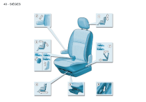 40 - SIÈGES SIÈGES - 41 LES SIÈGES AVANT 1. Réglage en hauteur de l’appuietête Pour le monter ou le descendre, faites-le coulisser. Le réglage est correct lorsque le bord supérieur de l’appuie-tête se trouve au niveau du dessus de la tête. Pour le retirer, amenez-le en position haute, appuyez sur les languettes et tirez-le vers le haut. Pour le remettre en place, engagez les tiges de l’appuie-tête dans les orifices en restant bien dans l’axe du dossier. Ne jamais rouler avec les appuie-tête déposés ; ceux-ci doivent être en place et correctement réglés. 2. Accoudoirs Ils sont rabattables. 3. Réglage de l’inclinaison du dossier A. Tournez la molette. B. Tirez sur le levier (version avec une seule porte latérale coulissante). 4. Réglage longitudinal Soulevez la commande et faites coulisser le siège vers l’avant ou vers l’arrière. 5. Tiroir de rangement (version avec airbag passager) Vous disposez d’un tiroir de rangement sous le siège avant passager. Pour l’ouvrir, soulevez-le et tirez. Ne pas placer d’objets lourds dans les tiroirs. 6. Commande des sièges chauffants Appuyez sur l’interrupteur. La température est régulée automatiquement. Une nouvelle pression interrompt le fonctionnement. Remarque : l’ordre d’activation du chauffage du ou des sièges reste en mémoire deux minutes après coupure du contact. 7. Accès aux places arrière (version avec une seule porte latérale coulissante) Soulevez la commande pour rabattre le dossier et avancez le siège. Lors de la remise en place, le siège revient à sa position initiale (côté conducteur). Personne, ni aucun objet ne doit empêcher le siège de revenir à sa position initiale ; le retour à cette position est nécessaire au verrouillage longitudinal. ">