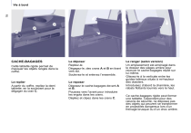 78 Vie à bord CACHE-BAGAGES Cette tablette rigide permet de masquer les objets rangés dans le coffre. Le replier A partir du coffre, repliez la demi tablette, en la soulevant pour la dégager du cran C. Le déposer Repliez-le. Dégagez-le, des crans A et B en tirant vers soi. Soulevez-le et enlevez l’ensemble. Le reposer Déposez le cache-bagages devant A et B. Poussez vers l’avant pour introduire les ergots dans les crans. Dépliez et clipez dans les crans C. Le ranger (selon version) Un emplacement est aménagé dans le dossier des sièges arrière pour recevoir le cache-bagages replié sur lui-même. Glissez-le à la verticale entre les guides latéraux situés à mi-hauteur des dossiers. Introduisez d’abord la charnière, les rabats flottants tournés vers le haut. Ce cache-bagages rigide peut former une tablette. Cependant pour des raisons de sécurité, ne déposez pas des objets qui peuvent se transformer en projectiles dangereux lors d’un freinage brusque ou d’un choc arrière. ">