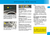 AFFICHAGE TÊTE HAUTE 3 4 1 2 ACTIVATION/ DÉSACTIVATION Le dispositif d’Affichage Tête Haute projette un ensemble d’informations importantes dans le champ de vision du conducteur. De cette manière, le conducteur ne quitte pas la route des yeux. Pour activer/désactiver l’Affichage Tête Haute : à partir de la mise du contact, appuyez sur la commande 1. L’état activé/désactivé à l’arrêt du moteur est conservé au redémarrage. RÉGLAGES DE L’AFFICHAGE TÊTE HAUTE Réglage en hauteur Pour régler en hauteur l’Affichage Tête Haute, appuyez sur les commandes 2 et 3. Une fois réglée il est recommandé d’ajuster celle-ci le plus bas possible. Réglage de la luminosité Les commandes de l’Affichage Tête Haute se situent sous l’aérateur côté conducteur. Le dispositif d’Affichage Tête Haute est muni d’un capteur de luminosité assurant une visibilité optimale des informations, quelle que soit la luminosité extérieure. Vous pouvez toutefois améliorer la luminosité des informations par rotation de la commande 1. Nota : • Dans certaines conditions météorologiques extrêmes (pluie et/ou neige, fort ensoleillement), l'Affichage Tête Haute peut ne pas être lisible ou perturbé momentanément. • Après la sortie d’un tunnel, un certain délai est nécessaire pour permettre au système d’adapter la luminosité de l’information à celle de l’extérieur. Remarque : Certaines lunettes peuvent dissimuler l'Affichage Tête Haute. II Mémorisation des positions de conduite et de l’Affichage Tête Haute Les réglages de l’Affichage Tête Haute sont pris en compte au moment de la mémorisation des positions de conduite (voir « Mémorisation ») et concernent : • La hauteur d’affichage. • La luminosité. • Les informations sélectionnées. Si l’Affichage Tête Haute n’est pas visible, il est recommandé de s’assurer de son réglage en hauteur (commandes 2 et 3) et de son activation (commande 1). 35 AFFICHAGE TÊTE HAUTE A B Pour suspendre l’affichage d’une information : C II G D F E CONTENU DE L’AFFICHAGE TÊTE HAUTE A Alerte « mini carburant » B Témoin « STOP » C Témoin « ESP » D Consignes de navigation E Témoin « SERVICE » F Témoin Feux de route G Vitesse du véhicule Pour connaître la signification des informations projetées, voir « Témoins lumineux ». Remarque : En cours de guidage, la consigne de navigation à suivre (flèches) clignote. Voir notice NaviDrive. 36 • Appuyez sur la commande 4. • Sélectionnez par rotation de la commande 1 l’information à suspendre. • Appuyez sur la commande 1. L’information clignote ; elle ne sera plus affichée. Pour quitter le mode de sélection, appuyez sur la commande 4. Nota : Les informations concernant la vitesse du véhicule, le témoin « STOP » et le témoin « ESP » ne peuvent pas être suspendues. Pour rétablir l’affichage d’une information : • Appuyez sur la commande 4. • Sélectionnez par rotation l’information qui clignote et dont vous souhaitez rétablir l’affichage. • Appuyez sur la commande 1. L’information ne clignote plus ; elle sera donc affichée. Pour quitter le mode de sélection, appuyez sur la commande 4. Nota : Tous les réglages et sélections réalisés avant l’arrêt du moteur sont conservés au démarrage. En cas de changement de conducteur, vérifiez si ces réglages sont adaptés et modifiez-les si nécessaire. CONSEIL • Le pare-brise de votre véhicule garantit le bon fonctionnement de l'Affichage Tête Haute. Il est recommandé de le changer dans le réseau CITROËN. • Aucun objet ne doit être posé dans ou sur la cavité située sur la partie haute de la planche de bord entre le pare-brise et l'arrière du combiné de bord. • Pour nettoyer la vitre, il est recommandé d’utiliser un tissu non abrasif. Il est recommandé de manipuler ces commandes uniquement véhicule à l'arrêt. ">