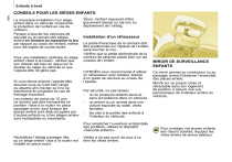 Enfants à bord 184 CONSEILS POUR LES SIÈGES ENFANTS La mauvaise installation d’un siège enfant dans un véhicule compromet la protection de l’enfant en cas de collision. Pensez à boucler les ceintures de sécurité ou le harnais des sièges enfant en limitant au maximum le jeu par rapport au corps de l’enfant, même pour les trajets de courte durée. Pour une installation optimale du siège enfant «face à la route», vérifiez que son dossier est bien en appui sur le dossier du siège du véhicule et que l’appuie-tête ne gêne pas. Si vous devez enlever l’appuie-tête, assurez-vous qu’il est bien rangé ou attaché afin d’éviter qu’il ne se transforme en projectile en cas de freinage important. Les enfants de moins de 10 ans ne doivent pas être transportés en position «face à la route» en place passager avant, sauf lorsque les places arrière sont déjà occupées par d’autres enfants ou si les sièges arrière sont inutilisables ou inexistants. Sinon, l’enfant risquerait d’être gravement blessé ou tué lors du déploiement de l’airbag. Installation d’un réhausseur La partie thoracique de la ceinture doit être positionnée sur l’épaule de l’enfant sans toucher le cou. Vérifiez que la partie abdominale de la ceinture de sécurité passe bien sur les cuisses de l’enfant. CITROËN vous recommande d’utiliser un réhausseur avec dossier, équipé d’un guide de ceinture au niveau de l’épaule. Par sécurité, ne pas laissez : - un ou plusieurs enfants seuls et sans surveillance dans un véhicule, - un enfant ou un animal dans une voiture exposée au soleil, vitres fermées, - les clés à la portée des enfants à l’intérieur du véhicule. Pour empêcher l’ouverture accidentelle des portières, utilisez le dispositif «Sécurité enfants». Neutralisez l’airbag passager dès qu’un siège enfant «dos à la route» est installé en place avant. Veillez à ne pas ouvrir de plus d’un tiers les vitres arrière. MIROIR DE SURVEILLANCE ENFANTS Ce miroir permet au conducteur ou au passager avant d’observer l’ensemble des places arrière. Monté sur sa propre rotule et rétractable dans son logement de pavillon, il assure une vue panoramique de l’intérieur arrière du véhicule. Pour protéger vos jeunes enfants des rayons solaires, équipez les vitres arrière de stores latéraux. ">