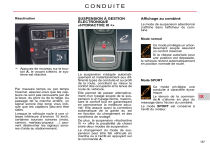 CONDUITE Réactivation SUSPENSION À GESTION ÉLECTRONIQUE «HYDRACTIVE III +» Affichage au combiné Le mode de suspension sélectionné s’affiche dans l’afficheur du combiné. Mode normal Ce mode privilégie un amortissement souple assurant un confort maximal. Si la vitesse autorisée pour une position est dépassée, le véhicule revient automatiquement en position normale de route. Appuyez de nouveau sur le bouton A, le voyant s’éteint, le système est réactivé. Par mauvais temps ou par temps hivernal, assurez-vous que les capteurs ne sont pas recouverts par de la boue, du givre ou de la neige. Au passage de la marche arrière, un signal sonore (bip long) vous indique que les capteurs peuvent être sales. Lorsque le véhicule roule à une vitesse inférieure d’environ 10 km/h, certaines sources sonores (moto, camion, marteau-piqueur, ...) peuvent déclencher les signaux sonores d’aide au stationnement. La suspension s’adapte automatiquement et instantanément aux différents types de conduite et au profil de la route, conciliant au mieux le confort des occupants et la tenue de route du véhicule. Elle permet de passer alternativement d’un typage souple de la suspension à un typage ferme, maximisant le confort tout en garantissant en permanence la meilleure sécurité. Elle assure aussi la correction automatique de la garde au sol en fonction du chargement et des conditions de roulage. De plus, la suspension «Hydractive III +» offre la possibilité de choisir entre deux modes de suspension. Le changement du mode de suspension peut être fait véhicule en marche ou à l’arrêt en appuyant sur la commande A. Mode SPORT Ce mode privilégie une conduite à caractère dynamique. Le témoin de la commande A s’allume en plus du message dans l’écran du combiné. Le mode SPORT est conservé à l’arrêt du moteur. IX 157 CONDUITE Positions du véhicule IX 158 Les changements de position ne s’effectuent que moteur tournant. La garde au sol réglable répond à tous les types de situation. Hormis quelques cas spécifiques, conduire en position normale demeure impératif. Appuyez une fois sur une des commandes de réglage. Le changement de position est indiqué par un message dans l’afficheur du combiné. Hauteur maximale Changement de roue (Impossible si vitesse > 10 km/h). Position normale Si la vitesse autorisée pour une position est dépassée, le véhicule revient automatiquement en position normale. Position intermédiaire Permet une augmentation de la garde au sol (Impossible si vitesse > 40 km/h). À utiliser sur des chemins difficiles à vitesse réduite et sur les rampes de parking. Hauteur minimale Pour aider au chargement ou au déchargement du véhicule. Contrôle atelier. Ne pas utiliser en marche normale (Impossible si vitesse > 10 km/h). CONDUITE Position non autorisée L’afficheur du combiné indique temporairement par un message l’impossibilité du réglage. Le véhicule reste en position autorisée et l’afficheur du combiné vous indique cette position. Variation automatique de la garde au sol - Si la vitesse dépasse 110 km/h, sur bonne route, la garde au sol est abaissée. Le véhicule revient en position normale si la route se dégrade ou si la vitesse est inférieure à 90 km/h. - À faible et à moyenne vitesse, si la route est dégradée, la garde au sol est augmentée. Le véhicule revient en position normale dès que les conditions le permettent. - À la coupure du contact, la garde au sol est abaissée en position parking. Pour votre sécurité dans le cas d’intervention sous le véhicule, il est obligatoire de le caler. IX 159 ">