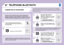 07 TÉLÉPHONE BLUETOOTH CONNECTER UN TÉLÉPHONE Pour des raisons de sécurité et parce qu’elles nécessitent une attention soutenue de la part du conducteur, les opérations de jumelage du téléphone mobile Bluetooth au système kit mains-libres du MyWay, doivent être réalisées véhicule à l’arrêt et contact mis. * Les services disponibles sont dépendants du réseau, de la carte SIM et de la compatibilité des appareils Bluetooth utilisés. Vérifiez sur le manuel de votre téléphone et auprès de votre opérateur, les services auxquels vous avez accès. Une liste des téléphones mobiles proposant la meilleure offre est disponible dans le réseau. 3 Pour une première connexion, sélectionner «Rechercher un téléphone» et appuyer sur la molette pour valider. Sélectionner ensuite le nom du téléphone. RECHERCHER UN TÉLÉPHONE 1 Activer la fonction Bluetooth du téléphone. Le dernier téléphone connecté se reconnecte automatiquement. 4 Une fois le téléphone connecté, MyWay peut synchroniser le carnet d’adresses et le journal des appels. Cette synchronisation peut prendre quelques minutes*. 2 Appuyer sur la touche PHONE. La liste des téléphones précédemment connectés (4 au maximum) s’affichent sur l’écran multifonction. Sélectionner le téléphone choisi pour une nouvelle connexion. Saisir le code d’authentification sur le téléphone. Le code à saisir est affiché à l’écran. 1 Pour changer le téléphone connecté, appuyer sur la touche PHONE, puis sélectionner Menu «Téléphone» et appuyer sur la molette pour valider. 2 Sélectionner «Connecter un téléphone». Sélectionner le téléphone et appuyer pour valider. CONNECTER UN TÉLÉPHONE 168 07 TÉLÉPHONE BLUETOOTH RECEVOIR UN APPEL 1 2 Un appel entrant est annoncé par une sonnerie et un affichage superposé sur l’écran multifonction. Sélectionner l’onglet «Oui» pour accepter ou «Non» pour refuser et valider en appuyant sur la molette. OUI 3 PASSER UN APPEL NON Pour raccrocher, appuyer sur la touche PHONE ou appuyer sur la molette et sélectionner «Raccrocher» et valider en appuyant sur la molette. RACCROCHER Appuyer sur l’extrémité de la commande sous volant pour accepter l’appel ou raccrocher l’appel en cours. 1 Appuyer sur la touche PHONE. La liste des 20 derniers appels émis et reçus depuis le véhicule apparaît en dessous de Menu «Téléphone». Vous pouvez sélectionner un numéro et appuyer sur la molette pour lancer l’appel. 2 Sélectionner la fonction Menu «Téléphone» et appuyer sur la molette pour valider. MENU «TÉLÉPHONE» Sélectionner «Numéroter», puis composer le numéro de téléphone à l’aide du clavier virtuel. NUMÉROTER Le choix d’un numéro peut aussi se faire à partir du carnet d’adresses. Vous pouvez sélectionner «Appel depuis carnet d’adresses». Le MyWay permet d’enregistrer jusqu’à 4000 fiches. Appuyer plus de deux secondes sur l’extrémité de la commande sous volant pour accéder au carnet d’adresses. Pour effacer un numéro, appuyer sur la touche PHONE, puis un appui long sur un numéro d’appel affiche une liste d’actions dont : Effacer entrée Effacer la liste 169 ">