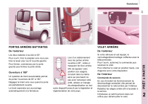 PORTES ARRIÈRE BATTANTES VOLET ARRIÈRE De l’extérieur De l’extérieur Les deux battants s’ouvrent à 90°. Pour ouvrir, tirez la poignée vers vous puis tirez le levier pour ouvrir la porte gauche. Pour fermer, commencez par la porte gauche puis fermez la porte droite. Ouverture à 180° Un système de tirant escamotable permet de porter l’ouverture de 90° à 180°. Dégagez le tirant vers vous quand la porte est partiellement ouverte. Le tirant reprendra son accrochage automatiquement à la fermeture. Lors d’un stationnement avec les portes arrière ouvertes à 90°, celles-ci masquent les feux arrière. Afin de signaler votre position aux usagers, circulant dans le même sens qui pourraient ne pas avoir remarqué votre arrêt, utilisez un triangle de présignalisation ou tout autre dispositif prescrit par la législation et réglementation de votre pays. Si votre véhicule en est équipé, le verrouillage/déverrouillage s’effectue avec la télécommande. Pour l’ouvrir, actionnez la commande puis soulevez le volet. Pour refermer le volet en position haute, une dragonne est à votre disposition. De l’intérieur Commande de secours En cas d’incident de fonctionnement du déverrouillage centralisé, elle permet de décondamner le volet arrière par l’intérieur. Rabattez les sièges arrière afin d’accéder à la serrure. Introduisez un petit tournevis dans cet orifice pour déverrouiller le volet. PRÊT à PARTIR 23 Ouvertures 2 ">