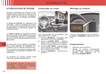 CONDUITE LE RÉGULATEUR DE VITESSE Commandes au volant Affichage au combiné Les commandes de ce système sont regroupées sur le volant. 1. Touche «ON/OFF» : activation / désactivation du mode régulateur. 2. Touche «COAST SET» : mémorisation d’une vitesse de conduite et réduction de la vitesse de croisière. 3. Touche «ACC RES» : augmentation de la vitesse de croisière, et rappel de la vitesse mémorisée. 4. Touche «CANCEL» : arrêt de la régulation. Lorsque vous appuyez sur la touche 1, le témoin «CRUISE» s’allume au combiné. Système permettant de maintenir automatiquement la vitesse du véhicule à la valeur programmée par le conducteur, sans action sur la pédale d’accélérateur. La mise en marche du régulateur est manuelle : celle-ci nécessite une vitesse minimale du véhicule de 40 km/h et l’engagement du deuxième rapport en boîte manuelle. La mise à l’arrêt du régulateur est obtenue par action manuelle ou par action sur les pédales de frein ou d’embrayage ou en cas de déclenchement du système ASC. VII En appuyant sur la pédale d’accélérateur, il est possible de dépasser momentanément la vitesse programmée. Pour revenir à la vitesse programmée, il suffit alors de relâcher la pédale d’accélérateur. La coupure du contact annule toute valeur de vitesse programmée. Le régulateur ne peut, en aucun cas, remplacer le respect des limitations de vitesse, ni la vigilance, ni la responsabilité du conducteur. 114 Programmation Appuyez sur la touche 1. Réglez la vitesse programmée en accélérant jusqu’à la vitesse désirée, puis appuyez sur la touche 2 «COAST SET». CONDUITE Augmentation de la vitesse programmée Accélérations/Décélérations ponctuelles En utilisant la touche 3 «ACC RES» : - des appuis successifs permettent d’augmenter la vitesse par pas d’environ 1,6 km/h. - un appui maintenu sur cette touche permet d’augmenter la vitesse progressivement. Une fois la vitesse souhaitée atteinte, relâchez la touche, la nouvelle vitesse est mémorisée. En utilisant la pédale d’accélérateur : - accélérez pour atteindre la vitesse souhaitée, puis appuyez sur la touche 2 «COAST SET». Relâchez la pour mémoriser la nouvelle vitesse. Accélération ponctuelle Enfoncez normalement la pédale d’accélérateur. En relâchant la pédale, vous revenez à la vitesse mémorisée. Diminution de la vitesse programmée En utilisant la touche 2 «COAST SET» : - des appuis successifs permettent de diminuer la vitesse par pas d’environ 1,6 km/h. - un appui maintenu sur cette touche permet de diminuer la vitesse progressivement. Une fois la vitesse souhaitée atteinte, relâchez la touche, la nouvelle vitesse est mémorisée. En utilisant la pédale de frein : - freinez pour désactiver la régulation, puis appuyez sur la touche 2 «COAST SET». Relâchez la pour mémoriser la nouvelle vitesse. Réactivation de la fonction Lorsque le régulateur de vitesse a été désactivé, vous pouvez revenir à la vitesse mémorisée en appuyant sur la touche 3 «ACC RES» dès que vous atteignez une vitesse minimum de 40 km/h. Décélération ponctuelle Enfoncez la pédale de frein pour réduire la vitesse. Pour revenir à la vitesse mémorisée, appuyez sur la touche 3 «ACC RES». Désactivation de la fonction Pour désactiver le régulateur de vitesse : Appuyez sur la pédale de frein ou d’embrayage, ou Appuyez sur la touche 1 «ON OFF», ou Appuyez sur la touche 4 «CANCEL». Le régulateur de vitesse peut être désactivé automatiquement : Lorsque le véhicule atteint une vitesse inférieure à 35 km/h. Lorsque le système de contrôle actif de stabilité (ASC) agit. Lorsque la régulation est en marche, soyez vigilant si vous maintenez appuyée l’une des touches de modification de la vitesse programmée : cela peut entraîner un changement très rapide de la vitesse de votre véhicule. Ne pas utiliser le régulateur de vitesse sur route glissante ou en circulation dense. En cas de forte descente, le régulateur de vitesse ne pourra pas empêcher le véhicule de dépasser la vitesse programmée. Pour éviter toute gêne sous les pédales : - veillez au bon positionnement du surtapis, - ne superposez jamais plusieurs surtapis. VII 115 ">