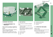 129 Changer une roue 2. LES OUTILS 1. LE STATIONNEMENT DU VÉHICULE Ils sont situés sous l’assise du passager avant. Tournez le bouton d’un quart de tour puis tirer la boîte. Après utilisation, appuyez sur le bouton puis tournez d’un quart de tour afin de bloquer la boîte. Dans la mesure du possible, immobilisez le véhicule sur un sol horizontal, stable et non glissant. Serrez le frein de stationnement, coupez le contact et engagez la première. Placez une cale, si possible, sous la roue diagonalement opposée à celle à remplacer. A. Douille rallongée. B. Clé à cliquet. C. Cric. D. Crochet de remorquage. E. Clé démonte-roue. F. Tournevis. 3. LA ROUE DE SECOURS Châssis cabine La vis de maintien de la roue de secours est située sur le coté arrière droit. Tournez la vis à l’aide de la douille A et la clef B pour libérer la roue. AIDE RAPIDE CHANGER UNE ROUE 8 130 Changer une roue Fourgon La vis de maintien de la roue de secours est située sur le bord extérieur du plancher arrière droit. Ouvrir les portes arrière. Déclippez le cache de protection. Introduire la douille A dans le trou puis dévissez la vis, avec la clé à cliquet B, pour descendre la roue. - Sortez la roue de secours à l’aide de la clé. Dévissez la poignée G et retirez le support H. Dégagez la roue de secours et la placez près de la roue à remplacer. 4. LE MODE OPÉRATOIRE - Déposez l’enjoliveur en faisant levier avec le tournevis F. Débloquez les boulons à l’aide de la clé démonte-roue E. - Positionnez le cric C à l’un des quatre emplacements prévus sur le soubassement à proximité des roues. Si vous avez un marche-pied escamotable, le cric doit être positionné à 45°. - - Développez le cric à l’aide de la clé à cliquet B jusqu’à ce que la roue soit à quelques centimètres du sol. Dévissez complètement les boulons et changez la roue. - - Accrochez le support H et vissez la poignée G. Introduire la douille A dans le trou puis vissez la vis, avec la clé à cliquet B, pour remonter la roue. Rangez l’outillage et l’enjoliveur. Ne vous engagez jamais sous un véhicule levé par un cric (utilisez une chandelle). La roue de secours n’est pas conçue pour faire du roulage sur de longues distances, faites rapidement contrôler le serrage des vis et la pression de la roue de secours par le réseau CITROËN. Faites également réparer et remonter la roue d’origine au plus vite par le réseau CITROËN. 131 Changer une roue 6. LE REMONTAGE DE LA ROUE RÉPARÉE - - Mettez la roue en place sur le moyeu et amorcez le vissage des boulons à la main. Effectuez un premier serrage à l’aide de la clé démonte-roue E. Redescendre complètement le véhicule en repliant le cric, puis dégagez-le. Serrez à nouveau les boulons avec la clé E, bloquez-les sans forcer. Replacez la roue à réparer à l’arrière du véhicule. Rubrique 9, partie «Éléments d’identification» pour localiser l’étiquette des pneumatiques. AIDE RAPIDE 5. LE MONTAGE DE LA ROUE DE SECOURS Le remontage de la roue est le même que celui de l’étape 5 en n’oubliant pas de replacer l’enjoliveur de roue. 8 ">
