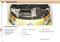 10 VÉRIFICATIONS LES MOTEURS ESSENCE 110 1. Réservoir de lave-vitre et de lave-projecteurs. 4. Réservoir du liquide de frein. 7. Jauge d’huile moteur. 2. Réservoir du liquide de refroidissement. 5. Batterie 8. Remplissage de l’huile moteur. 3. Filtre à air*. 6. Boîte à fusibles. * Suivant motorisation. ">