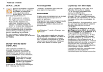 34 Poste de conduite DÉPOLLUTION Roue dégonflée Capteur(s) non détecté(s) EODB (European On Board Diagnosis) est un système européen de diagnostic embarqué répondant, entre autres, aux normes d’émissions autorisées en : Contrôlez la pression des pneus le plus rapidement possible. Une (ou plusieurs) roue n’est plus détectée. Consultez le réseau CITROËN pour remplacer le(s) capteur(s) défaillant(s). Ce message s’affiche également lorsque l’une des roues est éloignée du véhicule, (en réparation) ou lors du montage d’une roue non équipée de capteur. Toute réparation, changement de pneu sur une roue équipée de ce système doit être effectué par le réseau CITROËN. Le système de détection de sousgonflage est une aide à la conduite qui ne remplace ni la vigilance, ni la responsabilité du conducteur. Ce système ne dispense pas de faire contrôler régulièrement la pression des pneumatiques (y compris la roue de secours), pour s’assurer que le comportement dynamique du véhicule demeure optimum et éviter une usure prématurée des pneumatiques, en particulier en cas de roulage sévérisé (forte charge, vitesse élevée). Le système peut être passagèrement perturbé par des émissions radioélectriques de fréquence voisine. - CO (monoxyde de carbone), HC (hydrocarbures imbrûlés), NOx (oxydes d’azotes) ou particules, détectées par des sondes à oxygène placées en amont et en aval des catalyseurs. Le conducteur est ainsi averti des dysfonctionnements de ce dispositif antipollution par l’allumage de ce témoin spécifique au combiné. Il y a un risque d’endommager le catalyseur. Faites vérifier par le réseau CITROËN. DÉTECTION DE SOUSGONFLAGE Des capteurs contrôlent la pression des pneus au roulage (vitesse supérieure à 20 km/h) et déclenchent une alerte en cas de dysfonctionnement ou de crevaison. Toute détection (roue dégonflée ou crevée, dysfonctionnement d‘un capteur) est signalée par une information graphique et sonore et accompagné d’un message sur l’écran. Roue crevée Arrêtez-vous immédiatement en évitant toute manœuvre brusque avec le volant et les freins. Changez la roue endommagée (crevée ou fortement dégonflée) et faites contrôler la pression des pneus dès que possible. Rubrique 7, partie «Changer une roue». Si la roue endommagée est stockée provisoirement à l’intérieur du véhicule, elle émettra à nouveau ce message pour rappeler la nécessité de la faire réparer, ce qui empêchera l’affichage d’une autre alerte du même type. ">