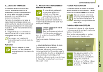 Si votre véhicule est équipé de cette fonction, les feux de position et de croisement s’allument automatiquement en cas de faible luminosité et lorsque les essuie-vitres sont détectés en fonctionnement continu. Par temps de brouillard ou de neige, le capteur de luminosité peut détecter une lumière suffisante. Les feux ne s’allumeront donc pas automatiquement. Si nécessaire, vous devez allumer manuellement les feux de croisement. Ils s’éteignent dès que la luminosité est redevenue suffisante ou après l’arrêt du balayage des essuie-vitres. Ne masquez pas le capteur de luminosité en partie centrale haute du pare-brise. Activation Tournez la bague sur cette position. Les feux s’éteignent automatiquement à la coupure du contact. ÉCLAIRAGE D’ACCOMPAGNEMENT (FOLLOW ME HOME) Si votre véhicule est équipé : lorsque vous quittez votre véhicule avec l’allumage automatique des feux activé (bague sur la position A), les feux de position et de croisement restent allumés pendant la durée sélectionnée (sortir d’un parking par exemple). Contact coupé ou clé sur la position STOP. Dans les 2 minutes qui suivent l’arrêt du moteur, positionnez la clé de contact sur la position STOP ou retirez la clé. Tirez la commande d’éclairage vers le volant. Le témoin s’allume au tableau de bord. Chaque action sur la commande d’éclairage, tirée vers le volant, prolonge l’accompagnement de 30 secondes jusqu’à environ 3 minutes. Une fois ce temps écoulé les feux s’éteignent automatiquement. Neutralisez cette commande en gardant plus de 2 secondes consécutives la commande tirée vers le volant. FEUX DE POSITION/PARK Ce dispositif permet de laisser les feux de position allumés en stationnement ; contact coupé, clé en position PARK ou clé retirée. Appuyez sur cette commande et tournez simultanément la clé d’un cran à l’inverse du sens de démarrage. Vous pouvez ensuite retirer la clé. FAISCEAU DES PROJECTEURS En fonction de la charge de votre véhicule, il est recommandé de corriger la hauteur du faisceau des projecteurs. Cette fonction est accessible en position feux de croisement et feux de route. Des appuis successifs sur ces commandes, situées sur la planche de bord, permettent le réglage des projecteurs. Un témoin sur l’afficheur indique la position de réglage choisie (0, 1, 2, 3). ERGONOMIE ET CONFORT ALLUMAGE AUTOMATIQUE 41 Commandes au volant 3 ">