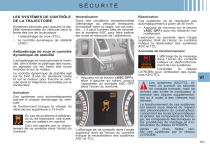 SÉCURITÉ LES SYSTÈMES DE CONTRÔLE DE LA TRAJECTOIRE Systèmes associés pour assurer la stabilité directionnelle du véhicule dans la limite des lois de la physique : - l’antipatinage de roue (TCL), - le contrôle dynamique de stabilité (ASC). Neutralisation Dans des conditions exceptionnelles (démarrage du véhicule embourbé, immobilisé dans la neige, sur sol meuble…), il peut s’avérer utile de neutraliser le système ASC pour faire patiner les roues et retrouver de l’adhérence. Anomalie de fonctionnement Antipatinage de roue et contrôle dynamique de stabilité L’antipatinage de roue optimise la motricité, afin d’éviter le patinage des roues, en agissant sur les freins des roues motrices et sur le moteur. Le contrôle dynamique de stabilité agit sur le frein d’une ou plusieurs roues et sur le moteur pour inscrire le véhicule dans la trajectoire souhaitée par le conducteur. Appuyez sur le bouton «ASC OFF», situé à gauche du volant, jusqu’à l’apparition du symbole ASC OFF dans l’écran du combiné. Activation Ces systèmes sont automatiquement activés à chaque démarrage du véhicule. Ils fonctionnent lorsque la vitesse du véhicule est supérieure à 15 km/h. En cas de problème d’adhérence ou de trajectoire, ces systèmes se mettent en marche. Ceci est signalé par le clignotement de ce symbole dans l’écran du combiné. Réactivation Ces systèmes ne se réactivent pas automatiquement à partir de 50 km/h. Appuyez de nouveau sur le bouton «ASC OFF» pour les réactiver manuellement. L’extinction du symbole dans l’angle supérieur droit de l’écran du combiné indique la réactivation des systèmes ASC et TCL. L’affichage de ce symbole dans l’angle supérieur droit de l’écran du combiné indique la neutralisation des systèmes ASC et TCL. L’affichage de ce message dans l’écran du combiné indique un dysfonctionnement de ces systèmes. Consultez le réseau CITROËN pour vérification des systèmes ASC/TCL. VI Les systèmes ASC/TCL offrent un surcroît de sécurité en conduite normale, mais ne doivent pas inciter le conducteur à prendre des risques supplémentaires ou à rouler à des vitesses trop élevées. Le fonctionnement de ces systèmes est assuré sous réserve du respect des préconisations du constructeur, concernant les roues (pneumatiques et jantes), les composants de freinage, les composants électroniques et les procédures de montage et d’intervention du réseau CITROËN. Après un choc, faites vérifier ces systèmes par le réseau CITROËN. 101 ">