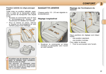 CONFORT Position tablette du siège passager avant Cette mise en position tablette, associée à celle de la banquette arrière, vous permet de transporter des objets longs. Poussez la commande vers le haut et accompagnez-le dossier vers l’avant pour le rabattre sur l’assise. Pour la remise en place, relevez le dossier et accompagnez-le vers l’arrière jusqu’à son blocage. BANQUETTE ARRIÈRE Réglage de l’inclinaison du dossier Chaque partie 1/3 - 2/3 est réglable individuellement. Réglage longitudinal Soulevez la commande et faites coulisser la banquette vers l’avant ou vers l’arrière. ! 3 Deux positions de réglage sont disponibles : - une position standard, - une position inclinée. Pour régler le dossier : Tirez la commande vers l’avant. N’oubliez pas de rabattre au préalable la tablette type «aviation» fixée au dos du siège. Par sécurité, un passager assis à l’arrière du véhicule ne doit pas poser ses pieds sur le siège avant mis en position tablette. 51 3 CONFORT Réglage des appuis-tête Position escamotable Flaps derrière la banquette La banquette arrière 1/3 - 2/3 est équipée d’appuis-tête virgule. Ils ont une position haute (confort et sécurité) et une position basse (visibilité arrière). Ils sont également démontables ; pour les enlever : tirez-le vers le haut jusqu’en butée, puis, appuyez sur l’ergot A. Avancez le siège avant correspondant si nécessaire. Placez les appuis-tête en position basse. Tirez la commande A, pour déverrouiller le dossier qui bascule aisément sur l’assise. Cette manoeuvre s’accompagne d’un recul automatique de l’assise. La banquette s’insère dans le plancher et offre un plancher plat et continu. Pour remettre le dossier en place : Basculez le dossier vers l’arrière jusqu’au verrouillage. Replacez l’assise dans la position souhaitée. Des flaps B fixés au dos de la banquette assurent la fermeture du fond du coffre lorsque la banquette est avancée. Tirez sur la partie supérieure des flaps pour les débloquer. Ils assurent alors la continuité du plancher plat. i 52 Lorsque des passagers sont installés à l’arrière, ne roulez jamais avec les appuis-tête déposés. Ceux-ci doivent être en place et en position haute. i Lors de la remise en place, veillez à ne pas coincer les ceintures de sécurité. i Veillez à ce qu’ils soient correctement fixés au dossier avant toute manipulation. La fixation de chaque flap sur l’arrière du siège est réalisée par deux clips démontables en plastique. Pour désolidariser les flaps de l’arrière du dossier, appuyez fortement sur la partie supérieure des deux clips plastiques, vers le bas, pour les libérer. Pour éviter tout risque de casse, ils se décrochent en cas de sollicitation excessive. ">