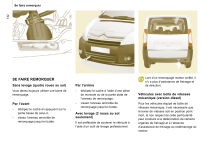 132 Se faire remorquer SE FAIRE REMORQUER Sans levage (quatre roues au sol) Par l’arrière Vous devez toujours utiliser une barre de remorquage. - Par l’avant - - déclipez le cache en appuyant sur la partie basse de celui-ci, vissez l’anneau amovible de remorquage jusqu’en butée. déclipez le cache à l’aide d’une pièce de monnaie ou de la partie plate de l’anneau de remorquage, vissez l’anneau amovible de remorquage jusqu’en butée. Avec levage (2 roues au sol seulement) Il est préférable de soulever le véhicule à l’aide d’un outil de levage professionnel. Lors d’un remorquage moteur arrêté, il n’y a plus d’assistance de freinage et de direction. Véhicules avec boîte de vitesses mécanique (version diesel) Pour les véhicules équipé de boîte de vitesses mécanique, il est nécessaire que le levier de vitesses soit en position point mort, le non respect de cette particularité peut conduire à la détérioration de certains organes de freinage et à l’absence d’assistance de freinage au redémarrage du moteur. ">