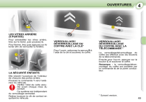 OUVERTURES 4 LES VITRES ARRIÈRE (5 PORTES) Pour entrebâiller les vitres arrière, tirez sur le levier, puis poussez-le. Pour fermer, tirez puis appuyez sur le levier afin de verrouiller la fenêtre. VERROUILLAGE/ DÉVERROUILLAGE DU COFFRE AVEC LA CLÉ* Pour l’ouvrir, actionnez la serrure B à l’aide de la clé et soulevez le coffre. LA SÉCURITÉ ENFANTS Elle interdit l’ouverture de l’intérieur de chacune des portes arrière. Poussez la commande 1 vers l’extérieur du véhicule. Vérifier l’état de cette sécurité avant chaque mise du contact. Ce système est indépendant du verrouillage centralisé. Retirez toujours la clé de contact en quittant le véhicule. VERROUILLAGE/ DÉVERROUILLAGE DU COFFRE AVEC LA TÉLÉCOMMANDE * Le verrouillage/déverrouillage du coffre est effectué avec les boutons de la télécommande. Ensuite pour l’ouvrir, appuyez sur le bouton C et soulevez le coffre. Remarque : le verrouillage/déverrouillage du coffre est possible par la commande A de la porte conducteur. * Suivant version. 49 4 OUVERTURES 2. Roue de secours / Rangements supplémentaires Située sous le tapis et un cache plastique, elle renferme les outils pour le changement de roue et le remorquage. LE COFFRE 1. Tablette arrière Pour enlever la tablette : - décrochez la tablette de sa fixation A, - tirez de chaque côté vers le haut pour la dégager de ses fixations, - soulevez puis inclinez légèrement la tablette pour la retirer. 50 Pour la ranger, deux possibilités : - soit derrière les sièges arrière, - soit à plat dans le coffre. Afin de disposer d’un volume supplémentaire, la roue de secours peut être enlevée temporairement (bac de coffre disponible en accessoires). ">