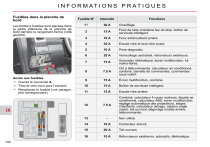 I N F O R M AT I O N S P R AT I Q U E S Fusibles dans la planche de bord Les boîtes à fusibles sont placées dans la partie inférieure de la planche de bord derrière le rangement fermé (côté gauche). Accès aux fusibles Ouvrez le couvercle A, Tirez-le vers vous pour l’extraire, Remplacez le fusible (voir paragraphe correspondant). Fusible N° Intensité 1? 30 A Chauffage. 2 15 A Feux de stop, troisième feu de stop, boîtier de servitude intelligent. 3 10 A Feux antibrouillard arrière. 4 30 A Essuie-vitre et lave-vitre avant. 5 10 A Prise diagnostic. 6 20 A Verrouillage centralisé, rétroviseurs extérieurs. 7 15 A Autoradio, télématique, écran multifonction, kit mains-libres. 8 7,5 A Clé à télécommande, calculateur air conditionné, combiné, barrette de commandes, commandes sous-volant. 9 15 A Écran multifonction, combiné. 10 15 A Boîtier de servitude intelligent. 11 15 A Essuie-vitre arrière. 12 7,5 A Combiné, calculateur 4 roues motrices, façade air conditionné, calculateur ABS, écran multifonction, réglage automatique des projecteurs, sièges chauffants, calculateur airbags, capteur angle volant, toit ouvrant, dégivrage lunette arrière, télécommande. 13 - 14 10 A Contacteur antivol. 15 20 A Toit ouvrant. 16 10 A Rétroviseurs extérieurs, autoradio, télématique. IX 144 Fonctions Non utilisé. I N F O R M AT I O N S P R AT I Q U E S Accès aux fusibles Ouvrez le couvercle A, Tirez-le vers vous pour l’extraire, Remplacez le fusible (voir paragraphe correspondant). Fusible N° Intensité Fonctions 17 10 A Calculateur 4 roues motrices. 18 7,5 A Feux de recul, calculateur aide au stationnement, caméra de recul, calculateur airbags. 19 15 A Prise accessoires. 20* 30 A Commandes de lève-vitres électriques. 21* 30 A Dégivrage lunette arrière. 22 7,5 A Rétroviseurs extérieurs chauffants. 23 - 24 25 A Siège électrique conducteur, éclairage de pieds, déverrouillage de la banquette arrière. 25 30 A Sièges chauffants. Non utilisé. IX ! * Les maxi-fusibles sont une protection supplémentaire des systèmes électriques. Toute intervention sur les maxifusibles doit être effectuée par le réseau CITROËN. 145 ">