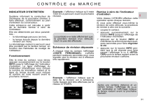 CONTRÔLE de MARCHE INDICATEUR D’ENTRETIEN Système informant le conducteur de l’échéance de la prochaine révision à faire effectuer, conformément au plan d’entretien du constructeur. Cette échéance est calculée à partir de la dernière remise à zéro de l’indicateur. Elle est déterminée par deux paramètres : - le kilométrage parcouru (en km), - le temps écoulé depuis la dernière révision (en mois). Le kilométrage restant à parcourir peut être pondéré par le facteur temps, en fonction des habitudes de roulage de l’utilisateur. Fonctionnement Dès la mise du contact, vous devez appuyer successivement sur le bouton INFO jusqu’à l’affichage de l’indicateur d’entretien. La ligne d’affichage du totalisateur kilométrique vous indique le nombre de kilomètres restant et la ligne du temps écoulé vous indique le nombre de mois restant avant la prochaine révision. Exemple : l’afficheur indique qu’il reste 7300 km à parcourir avant la prochaine révision. Le symbole «--» reste affiché tant que la première révision d’un véhicule neuf n’a pas été effectuée. Échéance de révision dépassée À chaque mise du contact, l’affichage «VISITE PERIODIQUE» s’affiche pendant quelques secondes pour vous signaler que la révision est à effectuer très rapidement. Exemple : l’afficheur indique que la date de la révision est à échéance. Cette révision doit être effectuée par le réseau CITROËN. Remise à zéro de l’indicateur d’entretien Votre réseau CITROËN effectue cette opération après chaque révision. Si vous avez effectué vous-même la révision de votre véhicule, la procédure de remise à zéro est la suivante : coupez le contact. appuyez successivement sur le bouton INFO jusqu’à l’affichage de l’indicateur d’entretien. appuyez sur le bouton INFO et maintenez-le enfoncé pendant quelques secondes pour faire clignoter la clé. appuyez sur le bouton INFO pendant que la clé clignote pour faire passer l’affichage «---» à «EFFACER» puis le temps restant avant la prochaine révision s’affiche. I Après une certaine distance et un certain temps, l’affichage de «---» est réinitialisé et l’affichage indique le temps restant avant la prochaine révision. 31 ">