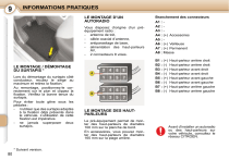 9 INFORMATIONS PRATIQUES LE MONTAGE D’UN AUTORADIO Vous disposez d’origine d’un prééquipement radio : - antenne de toit, - câble coaxial d’antenne, - antiparasitage de base, - alimentation des haut-parleurs AV, - 2 connecteurs 8 voies. B1 B2 B3 B4 B5 B6 B7 B8 LE MONTAGE / DÉMONTAGE DU SURTAPIS * Lors du démontage du surtapis côté conducteur, reculez le siège au maximum et retirez la fixation. Au remontage, positionnez-le correctement sur le pion et clippez la fixation. Vérifiez la bonne tenue du surtapis. Pour éviter toute gêne sous les pédales : - n’utiliser que des surtapis adaptés à la fixation déjà présente dans le véhicule. L’utilisation de cette fixation est impérative. - ne jamais superposer deux surtapis. 80 * Suivant version. Branchement des connecteurs A1 : A2 : A3 : A4 : (+) Accessoires A5 : A6 : (+) Veilleuse A7 : (+) Permanent A8 : Masse : : : : : : : : (+) (-) (+) (-) (+) (-) (+) (-) Haut-parleur Haut-parleur Haut-parleur Haut-parleur Haut-parleur Haut-parleur Haut-parleur Haut-parleur arrière droit arrière droit avant droit avant droit avant gauche avant gauche arrière gauche arrière gauche LE MONTAGE DES HAUTPARLEURS Le pré-équipement permet de monter des haut-parleurs de diamètre 100 mm sur la planche de bord. En accessoires, vous pouvez monter des haut-parleurs de diamètre 165 mm sur la plage arrière. Avant d’installer un autoradio ou des haut-parleurs sur votre véhicule, consultez le réseau CITROËN. ">