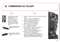 02 COMMANDES AU VOLANT 4 1. 1 2. LIMIT CRUISE 2 OFF Par appui successif : mode « Black Panel » - écran noir (conduite de nuit). Appui court pour téléphoner. Décrocher / Raccrocher. Accède au menu téléphone. Affiche le journal des appels. Appui long refuse un appel entrant. Appui : réécouter la consigne diffusée de navigation en cours. LIMIT CRUISE OFF Appui successif : sélection du type d’information présenté à l’écran. 3. Rotation : donne accès aux menus raccourcis selon affichage à l’écran. Appui court : valide le choix affiché à l’écran. Appui long : retourne au menu général. 4. Appui court : abandonne l’opération en cours. Refuse un appel téléphonique entrant. Appui long : retourne à l’affichage initial. 5. Menu : donne accès au menu général. 6. VOL + : augmente le volume sonore. 7. VOL - : diminue le volume sonore. 8. Par appui successif : coupe le son / rétablit le son. 9. Appui court : Radio : fréquence supérieure. Lecteurs musicaux : plage suivante. Appui long en accélère le défilement de l’écoute. 10. Appui court : Radio : fréquence inférieure. Lecteurs musicaux : plage précédente. Appui long en accélère le défilement de l’écoute. 11. Appui court : affichage de la liste des fréquences radio disponibles ou des plages, albums, répertoires. Appui long : met à jour la liste des stations captées. 3 5 MENU 6 7 8 9 LIST 11 10 267 ">