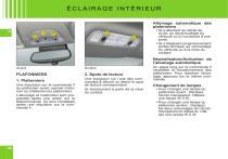ÉCLAIRAGE INTÉRIEUR Allumage automatique des plafonniers III 2 1 2 2 2 • Ils s’allument au retrait de la clé, au déverrouillage du véhicule ou à l’ouverture d’une porte. • Ils s’éteignent progressivement portes fermées, au verrouillage du véhicule ou à la mise du contact. Neutralisation/Activation de l’allumage automatique Avant Arrière PLAFONNIERS 2. Spots de lecture 1. Plafonniers Une impulsion sur la commande 1 du plafonnier avant, permet d’allumer ou d’éteindre les plafonniers. L’allumage et l’extinction sont progressifs après une action sur la télécommande. Ils sont immédiats après une impulsion sur la commande 1. 104 Une impulsion sur l’une des commandes 2 allume ou éteint le spot de lecture correspondant. Ils fonctionnent à partir de la mise du contact. Un appui long sur la commande 1 neutralise le fonctionnement des plafonniers. Pour réactiver l’éclairage, appuyez sur la même commande. Changement de lampes • Pour changer une lampe du plafonnier avant : Déclipez l’écran transparent. Utilisez une lampe W 5 W. • Pour changer une lampe du plafonnier arrière : Déclipez les deux entourages de l’écran transparent et retirez-le. Utilisez une lampe W 5 W. ÉCLAIRAGE INTÉRIEUR III ÉCLAIRAGE LATÉRAL D’AMBIANCE Il se situe dans la zone désignée par les flèches. ÉCLAIREURS D'ENTRÉE DE PORTE ÉCLAIREUR DE PLANCHER Porte ouverte, il permet d’éclairer le sol à l’extérieur du véhicule. À l’avant et à l’arrière, à l’ouverture d’une porte, il permet d’éclairer l’intérieur du véhicule. Changement de lampe Changement de lampe Pour changer la lampe de l'éclaireur d'entrée de porte : Déclipez le couvercle. Utilisez une lampe W 5 W. Pour changer la lampe de l'éclaireur de plancher (avant ou arrière) : Déclipez le couvercle. Utilisez une lampe W 5 W. C D Réglages Feux allumés, appuyez sur les commandes C ou D pour faire varier l’intensité de l’éclairage latéral d’ambiance. Arrière 105 ">