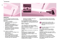 22 Ouvertures GIRAFON Ce volet arrière de pavillon de toit n’est compatible qu’avec les portes battantes. Pour ouvrir le girafon : - relevez la palette noire de la genouillère, - soulagez la genouillère en appuyant sur le girafon (vers le bas) puis dégagez le crochet, - soulevez le girafon, - dépassez le point de résistance pour bloquer le girafon avec les béquilles de maintien. Pour fermer le girafon : - vérifiez le bon verrouillage de la barre d’appui, - abaissez le girafon, - tout en appuyant sur le girafon (vers le bas), prenez les deux boucles du ressort puis placez le crochet dans son logement, - abaissez la palette noire pour verrouiller le girafon. Le verrouillage du girafon permet un bon placage sur le joint et garantit une étanchéité avec une absence de bruit. Barre d’appui Vous disposez d’une barre d’appui pour transporter des charges longues, après ouverture du girafon. Rabattez la barre d’appui en soulevant le levier. Accompagnez-la jusqu’au montant de porte. Maintenez les charges longues à transporter, soulevez-les et repositionnez la barre d’appui d’une seule main. Assurez-vous du bon verrouillage en appuyant sur la poignée vers le bas jusqu’à passer le point dur et attachez solidement les charges. Les supports latéraux peuvent être utilisés comme points d’accrochage. Le pare-chocs arrière a été renforcé pour servir de marchepied, lors de l’accès dans le véhicule. Ne roulez jamais sans la barre d’appui en place. Les portes arrière se verrouillent uniquement avec la barre d’appui installée. Lorsque le girafon est ouvert, faites attention dans les passages avec une hauteur limitée. N’appuyez jamais de charges directement sur les portes arrière. Respectez les codifications d’usage, pour attirer l’attention des autres conducteurs. ">