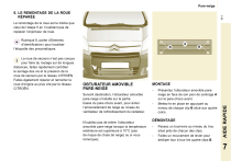Pare-neige 111 6. LE REMONTAGE DE LA ROUE RÉPARÉE Le remontage de la roue est le même que celui de l’étape 5 en n’oubliant pas de replacer l’enjoliveur de roue. Rubrique 8, partie «Eléments d’identification» pour localiser l’étiquette des pneumatiques. OBTURATEUR AMOVIBLE PARE-NEIGE Suivant destination, l’obturateur amovible pare-neige s’installe sur la partie basse du pare-chocs avant, pour éviter l’amoncellement de neige au niveau du ventilateur de refroidissement du radiateur. N’oubliez pas de retirer l’obturateur amovible pare-neige lorsque la température extérieure est supérieure à 10°C (pas de risque de chute de neige) ou si vous remorquez. MONTAGE - - Présentez l’obturateur amovible pareneige en face de son pion de centrage A sur le pare-chocs avant. Mettez-le en place en appuyant au niveau de chaque clip B situé aux quatre coins. DÉMONTAGE - Passez un tournevis au niveau du trou situé près de chacun des clips. Faites un mouvement de levier pour décliper tour à tour les quatre clips B. AIDE RAPIDE La roue de secours n’est pas conçue pour faire du roulage sur de longues distances, faites rapidement contrôler le serrage des vis et la pression de la roue de secours par le réseau CITROËN. Faites également réparer et remonter la roue d’origine au plus vite par le réseau CITROËN. 7 ">