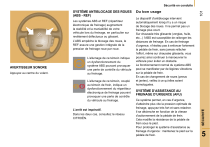 Les systèmes ABS et REF (répartiteur électronique de freinage) augmentent la stabilité et la maniabilité de votre véhicule lors du freinage, en particulier sur revêtement défectueux ou glissant. L’ABS empêche le blocage des roues, le REF assure une gestion intégrale de la pression de freinage roue par roue. AVERTISSEUR SONORE Appuyez au centre du volant. L’allumage de ce témoin indique un dysfonctionnement du système ABS pouvant provoquer une perte de contrôle du véhicule au freinage. L’allumage de ce témoin, couplé au témoin de frein, indique un dysfonctionnement du répartiteur électronique de freinage pouvant provoquer une perte de contrôle du véhicule au freinage. L’arrêt est impératif. Dans les deux cas, consultez le réseau CITROËN. Du bon usage Le dispositif d’antiblocage intervient automatiquement lorsqu’il y a un risque de blocage des roues. Il ne permet pas un freinage plus court. Sur chaussée très glissante (verglas, huile, etc...) l’ABS est susceptible de rallonger les distances de freinage. En cas de freinage d’urgence, n’hésitez pas à enfoncer fortement la pédale de frein, sans jamais relâcher l’effort, même sur chaussée glissante, vous pourrez ainsi continuer à manoeuvrer le véhicule pour éviter un obstacle. Le fonctionnement normal du système ABS peut se manifester par de légères vibrations sur la pédale de frein. En cas de changement de roues (pneus et jantes), veillez à ce qu’elles soient homologuées. SYSTÈME D’ASSISTANCE AU FREINAGE D’URGENCE (AFU) Ce système permet, en cas d’urgence, d’atteindre plus vite la pression optimale de freinage, appuyez très fort et sans relacher. Il se déclenche en fonction de la vitesse d’actionnement de la pédale de frein. Cela modifie la résistance de la pédale de frein sous le pied. Pour prolonger le système d’assistance au freinage d’urgence : maintenez le pied sur la pédale de frein. SÉCURITÉ SYSTÈME ANTIBLOCAGE DES ROUES (ABS - REF) 101 Sécurité en conduite 5 ">