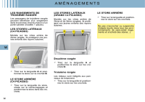 AMÉNAGEMENTS LES RANGEMENTS DE TROISIÈME RANGÉE LES STORES LATÉRAUX (GRAND C4 PICASSO) Les passagers de troisième rangée peuvent bénéficier d’un rangement dans le panneau droit et chacun d’un porte-canette (modèle 7 places). Montés sur les vitres arrière de 2ème et de 3ème rangées, ils protègent vos jeunes enfants des rayons solaires. LES STORES LATÉRAUX (C4 PICASSO) Montés sur les vitres arrière de 2ème rangée, ils protègent vos jeunes enfants des rayons solaires. VI Deuxième rangée Tirez sur la languette A et positionnez le store sur les crochets B. Tirez sur la languette A et positionnez le store sur le crochet B. LE STORE ARRIÈRE (C4 PICASSO) Tirez sur la languette du store, située sur le cache-bagages et positionnez le store dans les crochets. 98 Troisième rangée Les rideaux sont intégrés aux panneaux de brisement. Tirez sur la languette et positionnez le store sur les crochets. LE STORE ARRIÈRE Tirez sur la languette et positionnez le store sur les crochets. Ne pas s’accrocher ou suspendre d’objets lourds dans tous les environnements de pare-soleil (logements et crochets des stores...). ">