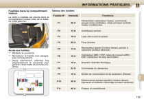 INFORMATIONS PRATIQUES Fusibles dans le compartiment moteur La boîte à fusibles est placée dans le compartiment moteur près de la batterie (côté gauche). Accès aux fusibles Déclipez le couvercle. Remplacez le fusible (voir paragraphe correspondant). Après intervention, refermez très soigneusement le couvercle pour garantir l’étanchéité de la boîte à fusibles. 11 Tableau des fusibles Fusible N° Intensité Fonctions F1 20 A Alimentation calculateur moteur, commande groupe moto-ventilateur, relais principal contrôle moteur multifonction. F2 15 A Avertisseur sonore. F3 10 A Lave vitre avant et arrière. F4 20 A Feux diurnes. F5 15 A Réchauffeur gazole (moteur diesel), pompe à carburant (moteur essence). F6 10 A Calculateur ABS / ESP, relais de coupure ABS / ESP, contacteur de stop secondaire. F7 10 A Direction assistée électrique. F8 25 A Commande du démarreur. F9 10 A Boîtier de commutation et de protection (Diesel). F10 30 A Electrovanne pompe injection (moteur diesel), injecteurs et bobines d’allumage (moteur essence). F11 40 A Pulseur air conditionné. 135 11 136 INFORMATIONS PRATIQUES Fusible N° Intensité Fonctions F12 30 A Petite / Grande vitesse essuie-vitre avant. F13 40 A Alimentation boîtier servitude intelligent (+ après contact). F14 30 A Alimentation valvetronic (essence). F15 10 A Feux de route droit. F16 10 A Feux de route gauche. F17 15 A Feux de croisement gauche. F18 15 A Feux de croisement droit. F19 15 A Alimentation contrôle moteur multifonction (moteur essence), électrovannes refroidissement air (Diesel). F20 10 A Alimentation contrôle moteur multifonction (essence), électrovanne régulation pression Turbo (Diesel), détecteur niveau eau moteur (Diesel). F21 5A Alimentation commande groupe moto ventilateur, relais APC, ABS ESP. INFORMATIONS PRATIQUES 11 Tableau des maxi-fusibles Fusible N° Intensité Fonctions MF1* 60 A Groupe moto ventilateur. MF2* 30 A Calculateur ABS / ESP. MF3* 30 A Calculateur ABS / ESP. MF4* 60 A Alimentation Boîtier de Servitude Intelligent. MF5* 60 A Alimentation Boîtier de Servitude Intelligent. MF6* - Non utilisé. MF7* - Boîtier fusibles habitacle. MF8* - Non utilisé. * Les maxi-fusibles sont une protection supplémentaire des systèmes électriques. Toute intervention sur les maxi-fusibles doit être effectuée par le réseau CITROËN. 137 ">