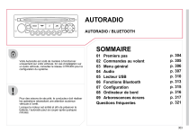 AUTORADIO AUTORADIO / BLUETOOTH SOMMAIRE Votre Autoradio est codé de manière à fonctionner uniquement sur votre véhicule. En cas d’installation sur un autre véhicule, consultez le réseau CITROËN pour la configuration du système. Pour des raisons de sécurité, le conducteur doit réaliser les opérations nécessitant une attention soutenue véhicule à l’arrêt. Lorsque le moteur est arrêté et afin de préserver la batterie, l’autoradio peut se couper après quelques minutes. 01 Premiers pas 02 Commandes au volant 03 Menu général 04 Audio 05 Lecteur USB 06 Fonctions Bluetooth 07 Configuration 08 Ordinateur de bord 09 Arborescences écrans Questions fréquentes p. p. p. p. p. p. p. p. p. p. 304 305 306 307 310 313 315 316 317 321 303 01 PREMIERS PAS 2 4 3 5 6 7 9 8 1 10 15 1. 2. 3. 4. 5. 6. 304 Marche / Arrêt et réglage du volume. Ejection du CD. Sélection de l’affichage à l’écran entre les modes : Fonctions audio (AUDIO), Ordinateur de bord (TRIP) et Kit mains-libres (TEL). Sélection de la source : radio, CD audio / CD MP3, USB, connexion Jack, Streaming. Sélection des gammes d’ondes FM1, FM2, FMast et AM. Réglage des options audio : balance avant / arrière, gauche / droite, loudness, ambiances sonores. 14 7. 13 Affichage de la liste des stations locales, des plages du CD ou des répertoires MP3. 8. Abandonner l’opération en cours. 9. Marche / Arrêt de la fonction TA (Annonce Trafic). Appui long : accès au mode PTY (TYpes de Programmes radio). 10. Validation. 11. Recherche automatique fréquence inférieure / supérieure. Sélection plage CD, MP3 ou USB précédente / suivante. 11 12 12. Sélection fréquence radio inférieure / supérieure. Sélection CD précédent / suivant. Sélection répertoire MP3 précédent / suivant. Sélection répertoire / genre / artiste / playlist précédente / suivante de l’équipement USB. 13. Affichage du menu général. 14. Touches 1 à 6 : Sélection station de radio mémorisée. Appui long : mémorisation d’une station. 15. La touche MUTE permet de couper ou de rétablir le son. ">
