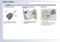 PRISE en MAIN OUVRIR 4 Clé à télécommande Commande centralisée manuelle Démarrage A. Verrouillage du véhicule. B. Déverrouillage du véhicule. 46 C. Verrouillage/déverrouillage du véhicule de l’intérieur (côté conducteur). 1. 2. 3. 4. Position Stop. Position Accessoires (1er cran). Position Marche (2ème cran). Position Démarrage. PRISE en MAIN OUVRIR Réservoir de carburant Après avoir ouvert la trappe, introduisez la clé puis tournez légèrement vers la gauche et ensuite revenez vers la droite. La clé revient dans sa position initiale et le bouchon est déverrouillé. Capot Retirez la clé et dévissez le bouchon. Après le remplissage du réservoir, revissez le bouchon à fond vers la droite jusqu’aux clics et refermez la trappe. Contenance du réservoir : 35 litres environ. Niveau mini carburant Quand ce pavé clignote, accompagné d’un signal sonore, il vous reste environ 50 km d’autonomie. 51 1. 2. 3. Commande intérieure. Commande extérieure. Béquille de capot. 64 5 PRISE en MAIN A L’INTÉRIEUR Prise auxiliaire pour équipements nomades Compatible avec un grand nombre de lecteurs MP3, cette prise permet d’écouter ses morceaux préférés lors de ses déplacements. Voir les conditions d’utilisation dans le chapitre «Audio». 23 Boîte de vitesses SensoDrive Cette boîte manuelle robotisée à cinq vitesses offre, au choix, le confort de l’automatisme ou le plaisir du passage manuel des vitesses. 62 6 Air conditionné manuel Ce système d’air conditionné optimise la répartition de l’air et sa température à l’intérieur de l’habitacle. 33 PRISE en MAIN LE POSTE DE CONDUITE 1. Commande d’ouverture du capot 2. Réglage des projecteurs 3. Neutralisation de l’airbag passager 4. Aérateur latéral orientable et obturable 5. Commande d’éclairage et d’indicateurs de direction 6. Airbag frontal conducteur Avertisseur sonore 7. Boîte à fusibles planche de bord (sous l’habillage du combiné, à droite et à gauche) 8. Compte-tours 9. Commande du rétroviseur extérieur passager 10. Commande électrique du lèvevitre passager 11. Levier de vitesses 12. Porte-gobelets 13. Réglage en hauteur du volant 7 PRISE en MAIN LE POSTE DE CONDUITE 1. Commande du rétroviseur extérieur conducteur 2. Combiné 3. Commande d’essuie-vitre 4. Antivol et contact 5. Signal de détresse 6. Rangements 7. Grille de diffusion 8. Buse de dégivrage et désembuage du pare-brise 9. Airbag frontal passager 10. Aérateur latéral orientable et obturable 11. Boîte de rangement 12. Autoradio 13. Commandes d’aération, de chauffage ou d’air conditionné 14. Rangements 15. Prise 12 V (120 W maxi) 16. Frein de stationnement 17. Commande électrique du lèvevitre conducteur 8 PRISE en MAIN BIEN S’INSTALLER Sièges avant 1. Réglage longitudinal. 2. Réglage de l’inclinaison du dossier. 3. Accès aux places arrière. 36 9 PRISE en MAIN BIEN S’INSTALLER 10 Lève-vitres électriques avant Rétroviseurs Réglage du volant (avec direction assistée) A. Commande d’ouverture et de fermeture. Appuyez ou tirez sur la commande A. 48 B. Commande de réglage des rétroviseurs extérieurs. En stationnement, les rétroviseurs sont rabattables et déployables manuellement. 35 C. Commande de verrouillage et de déverrouillage du réglage en hauteur du volant. 1. Commande déverrouillée. 2. Commande verrouillée. 35 PRISE en MAIN BIEN VOIR Commande d’éclairage Commande d’essuie-vitre Feux avant et arrière Feu antibrouillard arrière Bague A Bague B Feux éteints. Feux de position. Essuie-vitre avant MIST Balayage coup par coup. OFF Arrêt. INT Balayage intermittent. LO Balayage normal (pluie modérée). HI Balayage rapide (fortes précipitations). 52 Feux de croisement / Feux de route. Essuie-vitre et lave-vitre arrière Bague C 53 11 PRISE en MAIN BIEN VENTILER Chauffage Air conditionné Réglage du débit d’air Dégivrage de la lunette arrière Réglage de la température Réglage de la répartition d’air 32 12 Réglage du débit d’air Dégivrage de la lunette arrière Marche / Arrêt de la réfrigération Réglage de la répartition d’air Réglage de la température 33 Recirculation d’air / Entrée d’air PRISE en MAIN BIEN VENTILER Conseils de réglages intérieurs Chauffage ou Air conditionné manuel Je veux du... Répartition d’air Débit d’air Recirculation d’air / Entrée d’air extérieur Température AC manuel CHAUD FROID DÉSEMBUAGE DÉGIVRAGE 13 PRISE en MAIN BIEN SURVEILLER 14 Combiné Témoins Option ASR/ESP A. Compte-tours B. Afficheur C. Indicateur de niveau de carburant 17 Contact mis, les témoins d’alerte orange et rouge s’allument. Moteur tournant, ces mêmes témoins doivent s’éteindre. Si des témoins restent allumés, reportez-vous à la page concernée. 18 Le système de contrôle dynamique de stabilité (ASR/ESP) optimise la tenue de route du véhicule. Pour son bon fonctionnement, reportez-vous à la page concernée. 56 PRISE en MAIN BIEN SÉCURISER Neutralisation de l’airbag passager 1. Insertion de la clé. 2. Sélection de la position «OFF». 3. Retrait de la clé en maintenant la position. Airbag passager neutralisé Si l’airbag passager est neutralisé, ce témoin reste allumé pendant toute la durée de la neutralisation. 60 Fixations «ISOFIX» Votre véhicule a été homologué suivant la nouvelle réglementation ISOFIX. Les sièges arrière sont équipés d’ancrages ISOFIX réglementaires. Il s’agit de trois anneaux pour chaque assise : - deux anneaux inférieurs A, situés entre le dossier et l’assise du siège du véhicule, - un anneau supérieur B, appelé ancrage TOP TETHER, situé à l’arrière du dossier de siège en partie basse. Les sièges enfants ISOFIX sont équipés de deux verrous et/ou d’une sangle qui viennent facilement s’ancrer sur ces anneaux, signalés par des étiquettes ou par un marquage sur la tôle du dossier arrière. 42 Témoin de ceinture conducteur non bouc