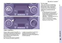 «GRIP CONTROL» Dans la neige, la boue et le sable, ce système de motricité est obtenu par un compromis entre sécurité, adhérence et motricité qui sont associés aux pneumatiques toutes saisons M+S (Mud and Snow). Il permet d’évoluer dans la majorité des conditions de faible adhérence. L’appui sur la pédale d’accélérateur doit être suffisant pour que la puissance du moteur permette aux différents paramètres d’être gérés de manière optimale. SÉCURITÉ Du bon usage Votre véhicule est principalement conçu pour circuler sur des routes goudronnées mais il vous permet d’emprunter occasionnellement d’autres voies moins carrossables. Cependant, il ne permet pas de réaliser des activités tout-terrain comme : - le franchissement et la conduite sur des terrains qui pourraient endommager le soubassement ou arracher des éléments (tuyau de carburant, refroidisseur carburant, ...) par des obstacles ou des pierres notamment, - rouler sur des terrains à fortes pentes et à adhérences réduites, - traverser un cours d’eau. 85 Sécurité en conduite 4 86 Sécurité en conduite Ce mode ESP est calibré pour un niveau de patinage faible, basé sur différentes adhérences habituellement rencontrées sur route. Après chaque coupure du contact, le système revient en mode ESP automatiquement. Ce mode neige permet de s’adapter aux conditions d’adhérence rencontrées pour chacune des deux roues avant, au démarrage. En phase de progression, le système optimise le patinage pour garantir la meilleure accélération possible en fonction de l’adhérence disponible. Ce mode ESP OFF n’est adapté qu’aux conditions rencontrées ESP OFF particulières au démarrage ou à basse vitesse. Au delà de 50 km/h, le système revient en mode ESP automatiquement. Ce mode tout chemin (boue, herbe humide, ...) autorise, lors du démarrage, beaucoup de patinage sur la roue la moins adhérente pour favoriser l’évacuation de la boue et retrouver du «grip». Parallèlement, la roue la plus adhérente est gérée de façon à passer le plus de couple possible. En phase de progression, le système optimise le patinage pour répondre, au mieux, aux sollicitations du conducteur. Ce mode sable autorise peu de patinage sur les deux roues motrices de façon simultanée pour faire progresser le véhicule et limiter les risques d’ensablement. Sur le sable, n’utilisez pas les autres modes sous peine d’enliser le véhicule. ">