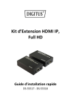 Kit d’Extension HDMI IP, Full HD Guide d'installation rapide DS-55517 - DS-55518 Sommaire 1. Introduction .............................................. 3 2. Fonctionnalités.......................................... 4 3. Contenu de la livraison ............................. 4 4. Caractéristiques techniques...................... 5 5. Vue d'ensemble du produit ...................... 6 5.1 Description de l’émetteur................... 6 5.2 Description du récepteur .................... 6 6. Exemples d’utilisation ............................... 7 6.1 Remarque : ......................................... 8 2 1. Introduction DS-55517 : Le Kit d’Extension HDMI est un système de transmission de signaux vidéos puissant qui se compose d'un émetteur / récepteur. Il permet d'étendre les signaux AV Full HD à l'aide d'un câble réseau Cat. 6 (liaison point à point) jusqu'à 120 m. De plus, en utilisant des commutateurs réseau et des récepteurs (DS-55518), vous pouvez distribuer votre contenu vidéo sur un maximum de 253 écrans via un réseau déjà existant (connexion IP) et l’étendre sur une distance illimitée. L'interface IR unidirectionnelle intégrée permet de contrôler à distance la source d'entrée à partir de l'écran de sortie (côté récepteur). DS-55518 : Complétez le Kit d’Extension HDMI IP (DS-55517) avec des récepteurs supplémentaires pour reproduire votre contenu audiovisuel sur plusieurs écrans en même temps. Le kit permet d'étendre les signaux AV Full HD à l'aide d'un câble réseau Cat. 6 (liaison point à point) jusqu'à 120 m. De plus, en utilisant des commutateurs réseau et des récepteurs (DS-55518), vous pouvez distribuer votre contenu vidéo sur un maximum de 253 écrans via un réseau déjà existant (connexion IP) et l’étendre sur une distance illimitée. 3 2. Fonctionnalités 1. Permet d'étendre les signaux AV Full HD avec un câble Cat. 6 sur une distance illimitée via l'infrastructure de réseau local existante ou des commutateurs réseau 2. Permet d'étendre les signaux AV Full HD jusqu'à 120 m avec un câble réseau Cat. 6 (liaison point à point) 3. Prise en charge de résolutions jusqu'à 1080p / 60 Hz, Full HD 4. Prise en charge de câble réseau Cat. 5e/6/6a/7/8 5. L'interface IR permet de contrôler à distance la source d'entrée à partir de l'écran de sortie 6. HDCP 1.3 7. Bande passante vidéo : 1,65 Gbit/s 3. Contenu de la livraison 1 x émetteur 1 x récepteur 1 x câble de transmission IR (1,5 m) 1 x câble récepteur IR (1,5 m) 2 x bloc d'alimentation (5 VCC / 2 A, 1,15 m) 1 x matériel de montage 1 x manuel utilisateur 4 4. Caractéristiques techniques Entrée de signal Signal HDMI Entrée de signal vidéo 0,5 – 1,0 VPP Sortie vidéo Distance de transmission (câble Cat. 6) Plage de fréquences verticales Bande passante de l'amplificateur vidéo Signal entrelacé (50/60 Hz) Signal HDMI Progressif (50/60 Hz) Garantie limitée Température de service Humidité relative de service Température de stockage Humidité relative de stockage Alimentation électrique Consommation électrique (max.) Certif. de l’unité d’extension Certif. alimentation électrique Adaptateur secteur 5 120 m à 1080p 50/60 Hz Jusqu’à 1,65 Gbit/s à 165 MHz (max.) 1080i 720p, 1080p 1 an pièces et main d’œuvre 0 °C à +50 °C 10 à 85 % HR (sans condensation) -10 °C à +80 °C 5 à 90 % HR (sans condensation) 5 VCC / 2 A 8W FCC, CE, RoHS FCC, CE, RoHS Normes US, UK, EU, AUS, etc. 5. Vue d'ensemble du produit 5.1 Description de l’émetteur 1. DC/5V 2. HDMI IN 4. LAN Tx 5. RESET 3. IR Tx 5.2 Description du récepteur 1. DC/5V 2. HDMI OUT 4. LAN Rx 5. RESET 6 3. IR Rx 6. Exemples d’utilisation 1. Mode « Simple » : 2. Mode « Allocation » : 3. Mode « Infinity » : 1. DVD 2. Câble HDMI 3. Câble Cat. 5e/6 4. HDTV 5. IR Tx 6. IR Rx 7 6.1 Remarque : L'adresse IP de l'expéditeur est définie sur 192.168.101.110, les clients utilisent le même segment de réseau IP que l'hôte PC pour saisir l'adresse IP afin de se connecter en arrière-plan pour modifier l'adresse IP et l'adresse MAC du produit via un navigateur Web ; l'adresse IP du récepteur est aléatoire. Paramétrage de l'adresse IP : Remarque : Les termes HDMI, HDMI High-Definition Multimedia Interface et le logo HDMI sont des marques commerciales déposées de HDMI Licensing LLC aux ÉtatsUnis et dans d'autres pays. 8 Assmann Electronic GmbH déclare par la présente que la Déclaration de Conformité est incluse dans la livraison. Dans le cas contraire, demandez l'envoi de la Déclaration de Conformité par courrier postal adressé au fabricant à l'adresse indiquée ci-dessous. www.assmann.com Assmann Electronic GmbH Auf dem Schüffel 3 58513 Lüdenscheid Allemagne 9 ">