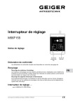 Interrupteur de réglage M56F155 Notice de réglage Déclaration de conformité PROG Touche de programmation Touche de direction DE EN Les déclarations de conformité actuelles sont disponibles sur notre site www.geiger.de Recyclage FR Recyclage des matériaux d’emballage Les matériaux d‘emballage sont des matières premières et donc réutilisables. Dans l‘intérêt de la protection de l‘environnement, veuillez adopter les méthodes de collecte sélective conformément aux prescriptions en vigueur dans votre pays. Recyclage des appareils électriques et électroniques Ni les appareils électroniques ni les batteries ne doivent être jetés avec les ordures ménagères. Informez-vous sur les systèmes de recyclage ou de mise au rebut prévus par les règlements en vigueur dans votre pays. Interrupteur de réglage … ... pour GJ5606 AE10. RESCUEline. Sous réserves de modifications techniques | 100W2524 fr V000 0221 1 Connexion de l’interrupteur de réglage HH HH II Seul l‘interrupteur de réglage M56F155 peut être utilisé pour régler le RESCUEline. L‘interrupteur de réglage M56F155 fonctionne avec des contacts libres de potentiel. Les travaux avec les bornes de service ne doivent être effectués que par un électricien qualifié. Information: La clé de programmation correspond à l‘opération simultanée des touches « HAUT » et « BAS ». Raccordement de l‘interrupteur de réglage bleu HAUT bleu brun BAS brun noir 12 V noir M PROG Réglage Moteur Moteur GEIGER GJ5606 AE10. RESCUEline II HH Remarque : veuillez-vous référer aux instructions d’utilisation des moteurs GJ5606 AE10. RESCUEline pour effectuer le réglage des fins de course. Ne branchez pas les connecteurs utilisés pour 230V à la prise de l‘interrupteur de service ou de réglage. Si le 230V est mal connecté aux connexions 12V, l‘appareil sera endommagé et tous les circuits 12V seront mis sous tension secteur. Une connexion incorrecte peut entraîner la mort et des blessures graves par électrocution. DE EN FR Pour toutes questions techniques veuillez nous contacter au : +49 (0) 7142 938 333. Gerhard Geiger GmbH & Co. KG Schleifmühle 6 | D-74321 Bietigheim-Bissingen T +49 (0) 7142 9380 | F +49 (0) 7142 938 230 [email protected] | www.geiger.de 2 Sous réserves de modifications techniques | 100W2524 fr V000 0221 ">