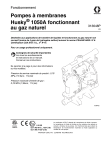 Fonctionnement Pompes à membranes Husky® 1050A fonctionnant au gaz naturel 313648P FR Destinées aux applications de transfert de liquides et fonctionnant au gaz naturel non corrosif (moins de 4 ppm de hydrogène sulfuré) suivant la norme CSA/AM ANSI LC 6. Certification CSA STD T.I.L. no R-14. Pour un usage professionnel uniquement. Consignes de sécurité importantes Lire tous les avertissements et instructions de ce manuel. Conserver ces instructions. Se reporter à la page 4 pour des informations sur les modèles. Pression de service maximale du produit : 0,76 MPa (7,6 bars ; 110 psi) Pression maximale d’entrée de gaz : 0,76 MPa (7,6bars ; 110 psi) ti13946a 5024314 II 2 GD Ex h IIC 66°C...135°C Gb Ex h IIIC T135°C Db La certification ATEX T dépend de la température du fluide à pomper. La température du fluide est limitée par les matériaux des pièces en contact à l'intérieur de la pompe. Voir Technical Data pour obtenir la température de fonctionnement maximale du fluide applicable au modèle de votre pompe. Manuel afférent Table des matières Manuel afférent . . . . . . . . . . . . . . . . . . . . . . . . . . . . 2 Pour trouver son distributeur le plus proche . . . . 3 Pour configurer une nouvelle pompe . . . . . . . . . . 3 Pour commander des pièces de rechange . . . . . . 3 Note aux distributeurs . . . . . . . . . . . . . . . . . . . . . . 3 Modèles . . . . . . . . . . . . . . . . . . . . . . . . . . . . . . . . . . 4 Date de fabrication . . . . . . . . . . . . . . . . . . . . . . . 4 Compatibilité avec les produits de traitement . . . 4 Avertissements . . . . . . . . . . . . . . . . . . . . . . . . . . . . 5 Installation . . . . . . . . . . . . . . . . . . . . . . . . . . . . . . . . 8 Informations générales . . . . . . . . . . . . . . . . . . . . 8 Serrage des fixations avant la configuration . . . . 8 Montage . . . . . . . . . . . . . . . . . . . . . . . . . . . . . . . 8 Mise à la terre . . . . . . . . . . . . . . . . . . . . . . . . . . . 8 Conduite de gaz . . . . . . . . . . . . . . . . . . . . . . . . . 9 Évacuation des gaz d’échappement . . . . . . . . . 10 Conduite d’alimentation en produit . . . . . . . . . . 12 Conduite de sortie du produit . . . . . . . . . . . . . . 12 Orifices d’entrée/de sortie du produit . . . . . . . . 12 Vanne de détente du produit . . . . . . . . . . . . . . . 13 Fonctionnement . . . . . . . . . . . . . . . . . . . . . . . . . . . 14 Procédure de décompression . . . . . . . . . . . . . . 14 Rinçage de la pompe avant la première utilisation 14 Serrage des fixations avant la configuration . . . 14 Démarrage et réglage de la pompe . . . . . . . . . . 14 Arrêt de la pompe . . . . . . . . . . . . . . . . . . . . . . . 14 Maintenance . . . . . . . . . . . . . . . . . . . . . . . . . . . . . . 15 Programme de maintenance . . . . . . . . . . . . . . . 15 Lubrification . . . . . . . . . . . . . . . . . . . . . . . . . . . . 15 Serrage des raccords filetés . . . . . . . . . . . . . . . 15 Rinçage et entreposage . . . . . . . . . . . . . . . . . . 15 Vérification pas-à-pas du fonctionnement . . . . . 15 Instructions concernant les couples de serrage 16 Réparation et pièces . . . . . . . . . . . . . . . . . . . . . 16 Dimensions . . . . . . . . . . . . . . . . . . . . . . . . . . . . . . . 17 Tableau de performances . . . . . . . . . . . . . . . . . . . 18 Données techniques . . . . . . . . . . . . . . . . . . . . . . . 19 Garantie standard de Graco . . . . . . . . . . . . . . . . . 20 Informations sur Graco . . . . . . . . . . . . . . . . . . . . 20 Manuel afférent Manuel Description 313435 Pompe pneumatique à membrane Husky 1050, Réparation/Pièces 2 313648P Pour trouver son distributeur le plus proche Pour trouver son distributeur le plus proche 1. Visiter le site www.graco.com. 2. Cliquer sur Où acheter et utiliser la Localisation d’un distributeur. Pour configurer une nouvelle pompe Merci d’appeler votre distributeur. OU Utiliser l’outil en ligne de sélection de pompe à membrane sur www.graco.com. Pour commander des pièces de rechange Merci d’appeler votre distributeur. Note aux distributeurs 1. Pour trouver les références des nouveaux kits/pompes, utiliser l’Outil en ligne de sélection de pompe à membrane. 2. Pour trouver les références des pièces de rechange : a. Utiliser le numéro de configuration situé sur la plaque d’identification de la pompe. Si l’on ne dispose que de la référence Graco à 6 caractères, utiliser l’outil de sélection pour trouver le numéro de configuration correspondant. b. Consulter le tableau des numéros de configuration à la page suivante pour déterminer les pièces correspondant à chaque chiffre. c. Consulter le manuel de réparation/pièces. Se reporter à la figure principale Pièces et au Guide de référence rapide des pièces/kits. Se reporter aux pages référencées sur ces deux pages pour obtenir plus d’informations pour commander des pièces, si nécessaire. 3. Merci d’appeler le service après-vente de Graco pour passer une commande. 313648P 3 Modèles Modèles Pièce Graco Numéro d’identification Graco 647043 647047 647124 647128 Taille et matériau de la pompe 1050A Type d’entraînement Orifices de 25,4 mm (1 po.), 189,3 l/min (50 g/min), aluminium Pneumatique 1050A-PAC1AA1BNBNBN— 1050A-PAC1AA1FKFKFK— 1050A-PAC1AA2BNBNBN— 1050A-PAC1AA2FKFKFK— Configuration P A C 1 Corps de Conformité Standard CSA pompe et vanne d’air en aluminium A Pas de contrôle des données Pression de service maximale psi (MPa ; bar) 110 (0,76 ; 7,6) 110 (0,76 ; 7,6) 110 (0,76 ; 7,6) 110 (0,76 ; 7,6) Couvercles et collecteurs de produit A1ou A2 Joints Sièges, billes de toriques de clapet anti-retour collecteur et membranes — BN ou FK A1 BN Aluminium, npt Buna-N A2 Aucun(e) FK Aluminium, bspt Fluoroélastomère FKM Date de fabrication Une date de fabrication est fournie sur l'étiquette série. La date est présentée comme AWWYY o