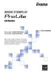 MODE D’EMPLOI FRANÇAIS Merci d’avoir choisi le moniteur LCD iiyama. Nous recommandons pour lire ce manuel complet soigneusement avant d'installer et alimenter le moniteur. Conserver ce manuel pour toute référence ultérieure. DECLARATION DE CONFORMITE AU MARQUAGE CE Ce moniteur LCD est conforme aux spécifi cations des directives CE/UE 2014/30/UE, aux directives EMC, les basses tensions 2014/35/UE, directives ErP 2009/125/CE et directives RoHS 2011/65/UE. La sensibilité électromagnétique a été choisie à un niveau permettant une utilisation correcte en milieu résidentiel, bureaux et locaux d’industrie légère et d’entreprises de petite taille, à l’intérieur aussi bien qu’à l’extérieur des immeubles. Tout lieu d’utilisation devra se caractériser par sa connexion à un système public d’alimentation électrique basse tension. IIYAMA CORPORATION: Wijkermeerstraat 8, 2131 HA Hoofddorp, The Netherlands FRANÇAIS Modèle No. : PL2493H Nous recommandons le recyclage des produits usagés. Contacter votre revendeur ou le support iiyama. Des informations sur le recyclages sont disponibles sur le site Internet : http://www.iiyama.com Nous nous réservons le droit de modifier les caractéristiques de nos produits sans préavis. Toutes les marques de fabrique utilisées dans ce mode d’emploi appartiennent à leurs propriétaires respectifs. ® En tant que partenaire du programme ENERGY STAR , iiyama a déterminé que ce produit répondait aux directives pour l’économie d’énergie édictées par ENERGY STAR®. ® Ce produit est conforme à ENERGY STAR avec le paramètre "réglage usine" et correspond au paramètre dans lequel une économie d'énergie sera réalisée. Le fait de modifier les paramètres d'image par défaut ou d'activer d'autres fonctionnalités augmentera la consommation d'énergie, ce qui pourrait dépasser les limites nécessaires pour bénéficier de la classification ENERGY STAR®. Numéro d’enregistrement Eprel XUB2493HSU-B1 : 352216, XU2493HSU-B1 : 352217 TABLE DES MATIERES POUR VOTRE SECURITE....................................................................1 CONSIGNES DE SECURITE...........................................................1 REMARQUES SUR LES ECRANS A CRISTAUX LIQUIDES (LCD)...3 SERVICE CLIENT............................................................................3 ENTRETIEN.....................................................................................3 AVANT D’UTILISER LE MONITEUR.....................................................4 FONCTIONS....................................................................................4 VÉRIFICATION DU CONTENU DE L’EMBALLAGE........................4 INSTALLATION ..............................................................................5 ProLite XUB2493HSU......................................................................7 ASSEMBLAGE ET DÉMONTAGE DE LA SOCLE DU PIED : ProLite XU2493HSU........................................................................8 COMMANDES ET CONNECTEURS : ProLite XUB2493HSU..........9 COMMANDES ET CONNECTEURS : ProLite XU2493HSU...........10 CONNEXION DE VOTRE MONITEUR : ProLite XUB2493HSU.... 11 CONNEXION DE VOTRE MONITEUR : ProLite XU2493HSU......12 DÉCONNECTER VOTRE MONITEUR..........................................13 MISE EN ROUTE DE L’ORDINATEUR..........................................13 AJUSTEMENT DE LA HAUTEUR ET L’ANGLE DE VISION : ProLite XUB2493HSU....................................................................13 RÉGLAGE DE L’ANGLE DE VISION : ProLite XU2493HSU........... 14 UTILISATION DU MONITEUR............................................................15 MENU DES PARAMÈTRES DE RÉGLAGE..................................16 AJUSTEMENTS DE L’ÉCRAN.......................................................24 SYSTÈME VEILLE.........................................................................27 DEPANNAGE .....................................................................................28 INFORMATIONS DE RECYCLAGE....................................................29 ANNEXE..............................................................................................30 CARACTÉRISTIQUES TECHNIQUES : ProLite XUB2493HSU-B1....30 CARACTÉRISTIQUES TECHNIQUES : ProLite XU2493HSU-B1..31 DIMENSIONS : ProLite XUB2493HSU..........................................32 DIMENSIONS : ProLite XU2493HSU.............................................32 FRÉQUENCES DE SYNCHRONISATION.....................................33 FRANÇAIS ASSEMBLAGE ET DÉMONTAGE DE LA SOCLE DU PIED : POUR VOTRE SECURITE CONSIGNES DE SECURITE AVERTISSEMENT MISE HORS TENSION DU MONITEUR EN CAS DE FONCTIONNEMENT ANORMAL En cas de phénomène anormal tel que de la fumée, des bruits étranges ou de la vapeur, débranchez le moniteur et contactez immédiatement votre revendeur ou le service technique iiyama. Tout autre utilisation peut être dangereuse et peut engendrer un incendie ou un choc électrique. NE JAMAIS OUVRIR LE BOITIER NE PAS INTRODUIRE D’OBJETS DANS LE MONITEUR N’insérez pas d’objets solides ou liquides tel que de l’eau à l’intérieur du moniteur. En cas d’accident, débranchez votre moniteur immédiatement et contactez votre revendeur ou le service technique iiyama. L’utilisation du moniteur avec un objet logé à l’intérieur peut engendrer un incendie, un choc électrique ou des dommages. INSTALLER LE MONITEUR SUR UNE SURFACE PLANE ET STABLE Le moniteur peut blesser quelqu’un s’il tombe ou s’il est lancé. NE PAS UTILISER SON MONITEUR PRES DE L’EAU N’utilisez pas le moniteur à proximité d’un point d’eau pour éviter les éclaboussures, ou si de l’eau a été répandue dessus cela peut engendrer un incendie ou un choc électrique. UTILISER LA TENSION SECTEUR SPECIFIEE Assurez-vous que le moniteur fonctionne à la tension d’alimentation secteur spécifiée. L’utilisation d’une tension incorrecte