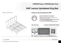 4708249(Taupe), 4708449(Light Gray) DHP Lamora Upholstered King Bed Weight Limit: 1000 lbs / 454 kg ""!!"*"!+ /0 + + 122 + 303 0 0 / / + ( -.//-01-123 2 222 0/ C.V - 2024/06/20 2024 Dorel Home Products All Rights Reserved B344708KG00CV 1 Tools required (not included) Phillips head screwdriver 2 PARTS LIST S B E C T H K Q D A J E N U R P M G L Q I O V P F 4 A PARTS LIST B Right Post 1 PC E C Left Post 1 PC F Headboard Leg 2 PCS D Headboard 1 PC G Footboard 1 PC Headboard Baffle 1 PC H Right Back Side Panel 1 PC Left Back Side Panel 1 PC PART NUMBERS PART LABELS A B C D E F G H 4708249 (Taupe) T4708249010CV T4708249020CV T4708249030CV T4708249040CV T4708249050CV T4708249060CV T4708249070CV T4708249080CV 4708449 (Light Gray) T4708449010CV T4708449020CV T4708449030CV T4708449040CV T4708449050CV T4708449060CV T4708449070CV T4708449080CV Each part has unique part number. Please refer to the appropriate part number when contacting customer service for replacement parts. Before throwing any packaging, please verify all contents and make sure you have received all the parts listed above! 5 I PARTS LIST J Right Fron Side Panel 1 PC M K Left Front Side Panel 1 PC N Cross Brace 1 PC L Back Center Rail 2 PCS O Back Slat 1 PC Front Center Rail 2 PCS P Front Slat 1 PC Footboard Leg 2 PCS PART NUMBERS PART LABELS I J K L M N O P 4708249 (Taupe) T4708249090CV T4708249100CV T4708249110CV T4708249120CV T4708249130CV T4708249140CV T4708249150CV T4708249160CV 4708449 (Light Gray) T4708449090CV T4708449100CV T4708449110CV T4708449120CV T4708449130CV T4708449140CV T4708449150CV T4708449160CV Each part has unique part number. Please refer to the appropriate part number when contacting customer service for replacement parts. Before throwing any packaging, please verify all contents and make sure you have received all the parts listed above! 6 Q PARTS LIST R Side Leg 2 PCS U S Center Leg 2 PCS USB HUB 1 PC Headboard bracket 2 PCS V Left Bracket 1 PC Right Bracket 1 PC PART NUMBERS PART LABELS Q R S T U V T 4708249 (Taupe) T4708249170CV T4708249180CV T4708249190CV T4708249200CV T4708249210CV T4708249220CV 4708449 (Light Gray) T4708449170CV T4708449180CV T4708449190CV T4708449200CV T4708449210CV T4708449220CV Each part has unique part number. Please refer to the appropriate part number when contacting customer service for replacement parts. Before throwing any packaging, please verify all contents and make sure you have received all the parts listed above! 7 1 2 5/16" X 2 2/16" Bolt 6 PCS 5 5/16" X 1 8/16" Bolt 12 PCS 6 1/4" X 1 3/4" Bolt 2 PCS 4708449(Light Gray) 7 1/4" X 3/5" Bolt 12 PCS Hardware Pack 4708249(Taupe) HARDWARE LIST 3 4 8 M4 X 25mm Screw 2 PCS 5/16" X 1 3/8" Bolt 6 PCS 5/16" X 11/16" Bolt 20 PCS 9 M3 X 15mm Screw 2 PCS 4mm L-Allen Key 1 PC Please do not completely tighten all the hardware, until the entire assembly is complete, unless otherwise indicated in the step-by-step instructions. HP #:24708KG0CV The screw(s), bolt(s) to be used at each step are shown in actual size in the lower right corner of the page. 8 Step 1 Please do not tighten the screws completely until step 5. Attach A & B to C with 2 . A C 2 9 C A 2 B X4 9 Step 2 Please do not tighten the screws completely until step 5. Attach E X 2 to A & B with 1 . A 1 E 9 E A 1 B X4 10 C 9 6 Step 3 Attach D & T x 2 to C with 6 . Attach D to E X 2 with 2 . E 2 T 9 D D C E D 2 T 6 X4 X2 11 9 Step 4 9 J Attach Q x 2 to G & I and H & J with 3 . Attach V to I, U to J with 3 . 3 3 Attach P X 2 to I and J with 6 . U H Q J 9 2 6 H P J U Q J G V Q I P 3 6 P X4 X 12 12 Please tighten the screws in step 1 and step 2 after completed step 5. Step 5 Attach G & H to A & B with 2 . B 2 9 B H H A G 2 X6 13 K 4 Step 6 9 Attach L & K to R with 4 . L R K R L X2 4 X4 14 3 Step 7 U F J 7.1 Attach F to U, V with 3 . F J 7.2 Attach F to P X 2 with 6 . 7.3 Attach L X 2 to F with 3 . 9 9 6 P 7.2 7.1 U J F F P 3 L V L I L 9 7.3 P 3 6 X4 X8 15 929 4 Step 8 Attach M to Q X 2 and R X 2 with 1 & 4 . M Q Q R M R 1 Q 29 4 1 M X2 X2 R 16 9 H 7 N H N 5 Attach N & O to G, H, I, J Attach N to G, H, & K with 7 7 N K O Step 9 Attach N to K with 5 H K J N 5 O G 7 I X2 X2 17 Step 10 8 S C Attach S to C with 8 . S C 8 X2 18 CAUTION: This unit is intended for use only with the products and/or maximum weights indicated. Use with other products and/or products heavier than the maximum weights indicated may result in instability or cause possible injury. Helpful Hints Ɣ0RYH\RXUQHZIXUQLWXUHFDUHIXOO\ZLWKWZRSHRSOH lifting and carrying the unit to its new location. Ɣ<RXUIXUQLWXUHFDQEHGLVDVVHPEOHGDQGUHDVVHPEOHG to move. Ɣ&OHDQWKHSURGXFWZLWKDVRIWGDPSFORWK'2 NOT use harsh chemicals or abrasive cleaners. Ɣ6RPHSDUWVKDYHEHHQSUHDVVHPEOHGIRUWKLVLWHP Ɣ7KH\DUHLOOXVWUDWHGRQWKLVSDJHDQGDYDLODEOHIRU replacement. Ɣ&KHFNEROWVDQGQXWVSHULRGLFDOO\DQGWLJKWHQLI necessary. WARNINGS: For safety reasons and to prevent injuries: Ɣ7KLVEHGLVQRWLQWHQGHGIRUXVHE\FKLOGUHQXQGHU years old. Ɣ3URKLELWMXPSLQJDQGKRUVHSOD\RQWKLVEHG Ɣ2QO\XVHDPDWWUHVVZKLFKLVORQJDQG -60" wide. Ɣ'RQRWXVHULVHUVXQGHUWKLVEHG End Cap T492760 X6 Weight Limit: 1000 lb / 454 kg 7KDW VLW<RX YHILQLVKHGDVVHPEOLQJ\RXU'H3 LDPRUD8SKROVWHUHG King %HG 19 4708249(Taupe), 4708449(Light Gray) Cama King tapizada Lamora de DHP jNO LO REGRESE A LA TIENDA! Si le faltan piezas o las que se incluyen estan daiiadas, con mucho gusto le enviaremos sus piezas de reemplazo sin cargo extra. Visite www.dhpfurniture.com/spa/replacement-parts o llame gratis al 1-800-267-1739 1 Hours. . . ES ADVERTENCIA " NÚMERO DE PIEZA 4708249(Marrón grisáceo) 4708449(Gris claro) HP #:24708KG0CV ETIQUETAS 4708249 DESCRIPCIÓN (Taupe) DE PIEZAS Columna Derecha T4708249010CV A Columna Izquierda T4708249020CV B Cabecera C T4708249030CV Confundir D T4708249040CV Pata E T4708249050CV Pie de Cama T4708249060CV F Panel Trasero Derecho T4708249070CV G Panel Trasero Izquierdo T4708249080CV H Panel Frontal Derecho T4708249090CV I Panel Frontal Izquierdo T4708249100CV J Guía central T4708249110CV 
