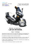 Les Vignes Vichet 73160 VIMINES Tél-fax : 04 79 62 63 22 Internet : www.ceclic.com e-mail : [email protected] Ceclic S.A.R.L. S.C.O.P. à capital variable APE 521J • SIRET 499 807 311 00018 RCS Chambéry • TVA N°FR 19 499 807 311 MANU E L DE MON TAGE : L B 12 5 R IVI ERA Etape 1 : Déballage Cette notice de montage est fournie à titre d’aide. Elle n’engage pas la responsabilité de la SARL CECLIC et ne peut en aucun cas se substituer au montage réalisé par un professionnel. Les opérations de montage ne sont pas couvertes par la garantie. La fabrication de ce modèle fait l’objet d’améliorations permanentes. Il est donc possible que votre scooter présente de légères différences par rapport à ce qui est décrit dans ce manuel. L’usage, la copie, la distribution de ce document pour un objet autre que le montage d’un scooter Ceclic est formellement interdit. © Ceclic - version n°24 mise à jour le mercredi 17 juin 2009 à 14:36:00 1.01 • Voici le scooter que vous avez reçu. 1.02 • Découper proprement le scotch central et enlever le carton en le tirant vers le haut. 1.03 • Le scooter est bien protégé et fixé sur la structure métallique. 1.04 • Découper le scotch qui tient les pièces détachées à l’aide d’un cutter. • Attention à ne pas rayer les pièces !. • Mettre les pièces de côté. 1.05 • Dévisser le boulon à l’arrière du scooter afin de retirer les attaches*. * peut varier selon version 1.06 • Puis remettre le boulon en place. Il nous servira à fixer le porte-bagage. 1.07 • Découper les attaches métalliques supérieures* à l’aide d’une pince coupante. * peut varier selon version 1.08 • A l’aide de 2 clés, dévisser tous les écrous / boulons de la partie supérieure de la structure métallique. 1.09 • Voici le scooter sans la structure métallique. • S’il reste des pièces détachées (roue avant, …), vous pouvez les enlever. 1.10 • Retirer les films et éléments protecteurs restants à l’aide d’un cutter • Attention à ne pas rayer les pièces avec le cutter. • NE PAS ENCORE ENLEVER LES PROTECTIONS DES FEUX. 1.11 • A l’aide de la clé de contact (située sur le démarreur), ouvrez la selle et vider le coffre avec les autres pièces détachées. • Liste des pièces* : - Rétroviseur gauche - Rétroviseur droit - Batterie - Trousse à outils - Manuel d’utilisation - Caches pour le fond du coffre - Sachet de vis * peut varier selon version Pièces détachées 1). Batterie + liquide 2). Bulle 3). Veilleuse avant* 4). Sachet de vis * peut varier selon version 5). Trousse à outils 6). Cache pour le fond du coffre 7). Cache pour le fond du coffre* 8). Manuel d’utilisation 9). V avant 10). Porte-bagage 11). Carénage du guidon * peut varier selon version 12). Garde-boue avant (2 parties emboîtées)* 13). Rétroviseurs avant 14). Roue avant * peut varier selon version Remplissage du liquide de la batterie Prendre la boite de la batterie et l’ouvrir • Toujours faire les opérations en mettant la batterie sur un carton afin d’éviter qu’un gravillon ne puisse fêler la batterie pardessous. • Enlevez le scotch de protection de la batterie en tirant dessus. • Positionnez le bidon à compartiments fourni (acide sulfurique), et pressez fortement dessus afin que les entrées se percent. • Le liquide s’écoule dans la batterie. • Si vous en versez à côté : essuyer rapidement les traces avec un chiffon. Ne pas toucher le liquide avec les doigts nus ! • Ne pas respirer les vapeurs et ventilez la pièce. • A l’aide d’une punaise, percer un trou en haut dans l’angle de chaque compartiment pour faire appel d’air afin que l’acide puisse s’écouler librement. • Laissez le liquide de batterie reposer pendant au moins 20 minutes. Sans cela, sa charge ne sera pas complète et sa durée de vie sera réduite ! • Refermer la batterie avec le cache fourni. • Il est vivement recommandé de charger la batterie encore pendant 30 minutes max avec un chargeur électrique. ">