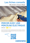 Les fiches conseils Réussissez chaque étape PERCER AVEC UNE PERCEUSE ÉLECTRIQUE Difficulté : Votre perceuse électrique permet le perçage de divers types de matériaux : cloisons en plâtre, murs en béton, bois, métal, briques, parpaings, etc. Pour la réussite de vos travaux et pour votre sécurité, il est important, néanmoins, d’utiliser les foret adaptés et de respecter les règles d’utilisation du matériel. z ici Flashe • Avec le propane, il est conseillé d’utiliser un détendeur (pression plus importante). ÉTAPE 1 Avant de commencer qu'il A/ Ce vous faut L'outillage : • perceuse • mèches ou forets adaptés • accessoires : scie trépan, etc. • rallonge électrique • gants et lunettes de protection B/ Quelle perceuse choisir ? La perceuse à percussion convient, selon le choix du mode de perçage, à tous les types de matériaux. Percussion : pierre, béton, ciment, brique, etc. Sans percussion : bois, métaux, plastique, céramique, verre, etc. Le diamètre de perçage varie selon la nature du matériau à percer et selon la puissance de la perceuse. Le variateur électronique permet d’adapter le vitesse de rotation aux différents types de matériaux et facilite l’emploi des accessoires C/ Quelle puissance choisir ? La puissance d’une perceuse d’étermine les capacités de travail de la machine. En règle générale, un moteur de 550 W convient pour tous les travaux d’entretien (perçage léger, vissage/dévissage, etc). Une puissance supérieur à 650 W permet d’aborder en toute quiétude les chantiers importants. ÉTAPE 2 La préparation 1 LA FIXATION DU FORET 2 • Insérer la queue du foret (ou de la mèche) à fond après avoir nettoyé les mors du mandrin, puis la retirer de quelques millimètres. Le serrage du mandrin varie selon les modèles. Consulter attentivement les notices d’utilisation, (le serrage d’un mandrin à clé doit être équitablement réparti sur chacun des mors) à proximité de la zone de perçage afin d’éviter sa flexion ou sa vibration. • Vérifier que l’emplacement du trou à percer ne coïncide pas avec un réseau encastré (conduits d’eau, gaines d’électricité, etc.) • Tracer d’une croix, et, si nécessaire, pointer l’emplacement exact du trou à percer pour assurer le centrage du foret. LA PRÉPARATION DU TRAVAIL • Fixer fermement la pièce à percer sur un plan stable, • Régler la profondeur de perçage en ajustant la butée ou en fixant un repère adhésif sur le foret. ÉTAPE 3 Quel foret ou mèche choisir ? Le profil et le diamètre de la queue d’un foret (ou d’une mèche) doivent correspondre à la capacité du mandrin et aux caractéristiques de la perceuse. La pointe et l’hélice d’un foret varient en fonction des différents types de matériaux. • Avant utilisation : fixer fermement la pièce à percer sur un plan stable. Contrôler la fixation du foret (ou de la mèche) et le serrage du mandrin. • En cours d’utilisation : maintenir la perceuse parfaitement dans l’axe de forage. Il est conseillé de porter gants et lunettes de protection. • Après utilisation : laisser le foret se refroidir et débrancher la perceuse pour le remplacer ou effectuer toute autre opération. p vitesse rapide vitesse moyenne q vitesse lente Mèches et forets Types Bois Ø Vitesse d’utilisation 4 6 8 10 13 Tout type de bois Stratifiés, Contreplaqués, Agglomérés p p Plate 6 à 38 mm Menuiserie (portes, huisseries, etc.) version extensible perçage manuel). Grand diamètre p Spirale unique 4 à 26 mm Bois de forte section (éléments de charpente, etc). Trous débouchants qqqq Tout métaux courants Acier inoxydable, Fonte, Aluminium, Inox q q Titane 2 à 10 mm Aciers traités Usage intensif qqq Cobalt 1 à 13 mm Aciers durs Aciers traités, inoxydables qqq 3 pointes 3 à 20 mm Métaux Matériaux et supports HSS 0,5 à 20 mm Forets spéciaux : Chacun d’entre eux correspond à un type de matériau : plastique (PVC, plexiglas), carrelage (sol ou mur), verre (faïence, porcelaine, etc) ou à une utilisation spécifique. Percussion Béton Standart Briques rouges, matériaux tendres. Tous matériaux. extra 3 à 20 mm Béton, Ciment, Brique, Céramique. Matériaux résistants. qqq Industrie 3 à 14 mm Granit, Marbre, Béton vibré. Matériaux très résistants qqq SDS 5 à 25 mm Béton vibré (haute densité) Granit, Pierre dure. qqq La vitesse d’utilisation doit être inversement proportionnelle au diamètre du foret (ou de la mèche) ainsi qu’à la dureté du matériau à percer. Consulter attentivement les notices d’utilisation de chacune des perceuses. ÉTAPE 4 Le perçage 1 MURS OU CLOISONS • Effectuer un avant-trou de diamètre plus petit pour obtenir un trou parfaitement calibré, sauf si le diamètre du foret est inférieur à 10 mm. • Placer la pointe du foret (ou de la mèche) en maintenant la perceuse perpendiculairement au plan de travail. • Commencer le perçage en vitesse lente. • Maintenir la perceuse parfaitement dans l’axe de forage en exerçant une pression constante • Dégager partiellement et régulièrement le foret pour faciliter l’évacuation des poussières ou des copeaux. • Extraire le foret en accélérant légèrement (en cas de blocage, inverser le sens de rotation). 2 LE BOIS • Pour éviter les éclats (trous débouchants), intercaler un morceau de bois (martyr) entre la pièce et l’établi. • Pour le décolletage avec une mèche à pointe de centrage (plate ou hélicoïdale) : travailler par rafales, et vérifier régulièrement la profondeur du perçage. Dès que le côté opposé est atteint, retourner la pièce et terminer le perçage. • Pour percer un trou de biais, placer un tasseau taillé selon l’angle qui convient pour guider la mèche. • Pour les trous de grand diamètre, utiliser une scie trépan munie d’un foret de centrage. • Pour encastrer une charnière invisible, utiliser une mèche à façonner 