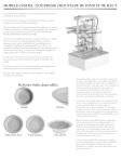 MODELE COMTEC 22OO PRESSE CROUSTADE DE FOND ET DE HAUT Le premier Presse rassemble en une seule opération, lafabrication de croustade de fond et de haut. Croustades de fond et de haut sont formées facilement, au meme instant et ont jusqu'a 30, 48 cm dediametre. Le Press fabrique des croustades uniformes, de taillesexactes. Inutile d'utiliser de la farine à saupoudrer,aucune dextérite ni force spéciale ou lait en boite n'est nécessaire, INUTILE D'UTILISER DES RESTES DEPATE POUR RECOUVRIR. On trouve des coquilles de moulage interchangeablesqui se forment au fur et à mesure en papier aluminium fabriqué sur place et importé et pour moules reutilis-ables de toute fabrication; les coquilles de moulagessont interchangeables sur le Presse. Les coquilles demoulage aluminium solide peuvent être immergées dans de l'eau pour tout lavage. Le systeme de chauffagedes coquilles de moulage fait partie du Presse et nandes coquilles. Forme jusqu'a 350 tartes recouvertes par heure; nécessite deux personnes pour le fonctionnement et unebonne répartition du travail. Peut former jusqu'a 700 croustades uniformes de fondpar heure et requiert une personne pour son fonctionnement. Ne pose aucun danger, fonctionne sans problèmes. Pas de gadget electrique ou mécanique. Rebords: Styles disponibles Simple Fuille d’une fleur Dentele Nid d’araignee Sans rebord Croustades parfaites pour tartes. tartelettes, gateaux de fro-mage, tartes de légumes ou de viandes sans compter tout autres speciallitees et articles três avantagluex que Comtec Press met a votre disposition. Les croutstades de miettes spéciales qui ne peuvent ni être roulées ni recouvertes se formentfacilement sur le Presse. La conception simple, la constructionrobuste et le fonctionnement facile du presse vous fournichaque jour de la pâte; une production profitable et sans peine. La qualitê de la croustade achevée est supérieure à celle qui été roulée manuellement. Les croustades roulées ne sont pas aussi bien faites et ont des grumeaux parcequ'elles ont été trop manipulées. Les croustades formées par Comtec Press sont floconneuses, tendres et peuvent être conservées deux fois aussi longtemps que la normale, grace à une coquille de moulagechauffee qui se forme et réduit les bactéries. Même les personnes peu hablies peuvent apprendre à faire fonctionner le Presse en quelques minutes. La procédure de fonctionnement simple requiert peu d'effort et diminue lafatigue de celui/celle qui le fait fonctionner. Un opérateurpeut former jusqu'a 700 croustades de fond par heure. Deux opérateurs peuvent produire jusqu'a 350 tartes recouvertes parheure avec une bonne répartition du travail. On trouve des coquilles de moulages qui se forment pour papier aluminium et moules solides réutiIisables. Des coquilles demoulages spéciales peuvent être fabriquées pour adhérer aux moules qu'on utilise pour des choses spéciales. 1. Mettre une portion de la pâte sous la coquille de moulage supérieure. et un moule avec un peu de pâte sous la coquille de moulage inférieure. 2. Appuyer les leviers pour former la croustade du fond et du haut. 3. Retirer du Presse la croustade du fond termine, et la crous-tade du haut situe sur la plaque de patisserie en polyfilm. 4. Recouvrir la croustade du fond qui a été remplie avec celle du haut. 5. Tailler etcoller la croustade du haut a celle du fond. 6. Retirer le porteur de la plaque de patisserie. • Couvercle de la • Coquille de moulage pour • Moyer de chauffage controlé par themostat • Distributeur polyfilm couronne en acier inoxydable croustade de haut rapidement changeable et lavable • Coquille de moulage chauffée pouvant etre retirée facilement pour tout lavage • Table polyfilm pour la fabrication de croustade de haut • Support guidant la plaque de la coquille de moulage • Unité de distribution electrique incorporee • Double levier de fonctionnement pour • Assemblage de base en acier • Réservoir de pétrole sans soudure en acier inoxydable (sous l’endroit oú se trouve la pâte) assurer toute securite inoxydable Equipement optionnel: Support mobile en acier inoxydable permettant au Presse d’être entiérement portatif et à hauteur de fonctionnement SPECIFICATIONS VITESSE DE FONCTIONNEMENT - allant jusqu’a 700 croustades de fond par heure, 350 tartes recouvertes par heire dont le fonctionnement est accompli par deux personnes. LONGEUR TOTALE - 61cm LARGEUR - 46.7cm • HAUTEUR - 71.1cm SPECIFICATIONS ELECTRIQUES- 220 Volt, 50 Hz, 1 Phase AC CAPACITE DU RESERVOIR EN PETROLE - 22.8 L S.A.E. n 10 sans détergent (pétrole non inclu) POIDS D’ENVOI – 94.5 kg. Coquilles de moulage ou instrument non inclus. Les coquilles de moulage sont séparées du moule d’essai. Fabriqué aux U.S.A. © Copyright Comtec Industries Ltd. COMTEC COMTEC INDUSTRIES, LTD. • 10210 WERCH DRIVE #204 WOODRIDGE, ILLINOIS 60517 PHONE:(630)759-9000 • FAX:(630)759-9009 E-MAIL:[email protected] • www.comtecindustriesltd.com ">