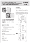 MANUEL D’INSTRUCTIONS COFFRETS DE PROTECTION ET CONTRÔLE POUR MANUELMONOPHASÉES D’INSTRUCTIONS POMPES SUBMERSIBLES CBM ONES MANUEL D’INSTRUCTIONS INSTRUCTIONS MANUAL COFFRETS DE PROTECTION ET CONTRÔLE POUR CONTROL COFFRETS DE POMPES PROTECTIONSUBMERSIBLES ET CONTRÔLE PROTECTION POURAND CONTROL PANELS MONOPHASÉES OFASICAS POMPES SUBMERSIBLES MONOPHASÉES FOR SINGLE-PHASE SUBMERSIBLE PUMPS Connexion diagram Schéma de connexions Connexion diagram To prevent electrical shocks whilst installing or operating the relay, the power supply. To prevent electrical shocks installingcouper or operating the relay, Avant le montage et la mise en service,disconnect couper l’alimentation Avant le montage et la mise enwhilst service, l’alimentation the power supply. secteur pour éviter toute décharge 1.secteur Checkpour that disconnect the auxiliary voltage supply is correct. éviter toute décharge 1. Check that the auxiliary voltage supply is correct. 1. Vérifier que la tension auxiliaire d’alimentation est la correct. 2.1.To a2.correct functioning of the install To a correct functioning of equipment, the equipment, thethe ca2. Installer le condensateur avec les μF spécifiés parensure le fabricant de Vérifier que la ensure tension auxiliaire d’alimentation estinstall la correct. pacitor with the µF with recommended by by the capacitor the μF recommended the manufacturer manufacturer of the of the la moto-pompe, le soutenir avec le support autoadhésif et le 2.motor-pump. Installer le condensateur lestheμF spécifiéssupport. par le fabricant deit motor-pump. Setavec it using auto-adhesive support. Connect connecter en C et L 1. Set it using the auto-adhesive Connect andsoutenir L1. laL1. avec le support autoadhésif et le 3. Connecter les câbles du moteur en C, CL1 to et Cmoto-pompe, and L1. it to C le 3. Connect wires of the motor to C, CL1 and L1. 4. Si les terminales P1 et P2 ne vont pas être utilisés pouren connecter C et of Lthe 1.the 3. Connect the un wires motor to C, CL1 and L1. trico / Conexionado Schéma de connexions as eléctricas durante la instalación o manipulación rarse de que no hay tensión en la línea e la tensión de la línea es la correcta. un buen funcionamiento del equipo y de la ectar el condensador con los μF especificados te de la motobomba. Sujetarlo con el soporte Conectarlo en C y L1. bles del motor en C, CL1 y L1. utilizar los terminales P1 y P2 para un presostato, mporizador, etc, estos terminales deberán estar un cable. If terminals P1 and P2 are not going to be used for a pressure pressostat, une bouée, un temporisateur, etc., ils doivent 4. être câbles moteur en C, CL1 etused L1.with switch, a timer, etc., they must be pontés avec un câble. 4.3.IfConnecter terminals les P1 anda buoy, P2duare not going to bebridged fora cable. a pressure a buoy, a timer, they must be être bridged with a cable. 5. Connect the power the terminals of theutilisés circuit breaker. 5. Connecter l’entrée du réseau dans les bornes disjoncteur. 4.switch, Sidules terminales P1 etetc., P2input netovont pas pour un ada de la red en las bornas del magnetotérmico pressostat, bouée, doivent être 5. Connect theune power inputun totemporisateur, the terminals ofetc., the ils circuit breaker. pontés avec un câble. 5.CBM-2 Connecter l’entrée du réseau dans les bornes du disjoncteur. IB (A) 14 Iin 11 Motor 230 V 50/60 Hz KM HP kW CONTACTEUR 3 ... 11 0.5 ... 2 0.37 ... 1.5 CBM-2 12312 3 ... 11 0.5 ... 2 0.37 ... 1.5 CBM-3 12314 11 ... 16 2 ... 3 1.5 ... 2.2 CBM-3 12314 11 ... 16 2 ... 3 1.5 ... 2.2 DISJONCTEUR 12312 KM RELAIS PS11-R KM out CONDENSATEUR L 14 Iout C P1 P2 PRESSOSTAT • Remote, or automatic reset every: CBM-3 Surcharge avec mémoire thermique. KM Parts Surtension: si la tension augmente plus d’un 15% sur la • Boîte en plastique avec couverclenominale transparent, 230 250 x 150 •mm, Plastic IP54case transparent 230 x 250 x 150 mm, IP 54 tension duxrelais, ceci arrêt lewith moteur. Au lid, moment • Circuit breaker 1P+N. • Disjoncteur 1P+N où la tension revient à des valeurs normales, le relais démarre RELAIS PS16-R RELÉ PS16-R Fanox PS • Fanox PS electronic relay. • Relais électronique le moteur automatiquement. • Contactor. • Contacteur 11 14 A1 Court-circuit. A2 11 14 A1 A2 • Switch ON/OFF • Interrupteur arrêt/ marche CL1 P1 P2 RELAIS PS11-R Iout A1 - PS11-R: 2 à 70 min. • 4 presse-étoupe. - PS16-R: 2 à 240 min. KM • L1Support autoadhésif pour le condensateur P1 P2 • 4 cable glands. KM • Indique • Prise de Iin KM C CL1 Compo L1 P1 P2 PRESSOSTAT SORTIE POMPE CIRCUIT BREAKER Iout L N PS16-R RELAY 11 • Interrup • Voyant • Réglette KM C P1 P2 PRESOSTATO • Indique la cause du déclenchement. SORTIE POMPE • Prise de contrôle pour pressostat, bouée, programmeur, etc. CBM-4 L1 • 4 presse P1 P2 Iin OUTPUT TO THE PUMP PRESSOSTAT Composants CL1 INPUT PRESSURE CONTACT KM CONTACTEUR • Boîte en plastique avec couvercle transparent, 230 x 250 x 150 mm, IP54 • Disjoncteur 1P+N • Relais électronique Fanox PS • Contacteur • Interrupteur arrêt/ marche • Voyant de signalisation • Réglette de connexions RELAIS PS16-R LN N L 11 CONDENSATEUR 14 A1 A2 Iout ENTRÉE RÉSEAU KM • 4 presse-étoupe. • Support autoadhésif pour le condensateur C • CT20 50/5 (Seulement CBM-4) SORTIE POMPE CL1 L1 • Disjonc • Contac Iout POWER INPUT • Boîte en • Relais é A1 A2 14 CAPACITOR KM • Auto-adhesive support forC theCL1 capacitor. L1 Ma Surc Sur ten où l le m Cou • Réarme - PS11- PS16- A2 INTERRUPTEUR OMBA ENTRÉE RÉSEAU • Connecting strip. INPUT PRESSURE CONTACT CONTACTOR INTERRUPTEUR MAGNÉTOTHERMIQUE INTERRUPTOR • Réglette de connexions Caracté A2 L1 OUTPUT TO THE PUMP CONTACTEUR CONDENSATEUR L N • Signalling toutes LED • Voyant de signalisation •IoutRéarmement à distance ou automatique les: 11 • Protect - PS16-R: 2 to 240 min. • Indique la cause Iin • Prot