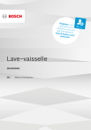 Register yo new devic ur e on MyBosch now and get free b enefits: bosch-h ome.com / welcome Lave–vaisselle SMV6EB800E [fr] Manuel d'utilisation fr Table des matières Sécurité............................................ 4 Indications générales ....................... 4 Utilisation conforme.......................... 4 Restrictions du périmètre utilisateurs.................................................. 4 Installation sécuritaire....................... 5 Utilisation sûre .................................. 7 Appareil endommagé....................... 8 Risques pour les enfants ................. 9 Prévention des dégâts matériels ................................................ 11 Installation sécuritaire..................... 11 Utilisation sûre ................................ 11 Protection de l'environnement et économies d'énergie ................ 12 Élimination de l'emballage ............. 12 Économiser l’énergie ..................... 12 Aquasensor .................................... 12 Capteurs ......................................... 13 Efficient Dry .................................... 13 Installation et branchement.......... 13 Contenu de la livraison .................. 13 Installation et raccordement de l’appareil ......................................... 14 Raccordement de l’eau usée ......... 14 Raccordement de l’eau potable..... 14 Raccordement électrique ............... 15 Description de l'appareil............... 16 Appareil .......................................... 16 Éléments de commande ................ 17 Programmes .................................. 20 Remarques concernant les laboratoires d’essai ............................... 22 Favourite .................................... 22 Fonctions additionnelles .............. 22 Équipement ................................... 23 Panier à vaisselle supérieur ........... 24 2 Panier à vaisselle inférieur ............. 25 Panier à couverts ........................... 25 Étagère ........................................... 25 Tiges rabattables............................ 26 Étagère à couteaux ........................ 26 Zone Extra Clean ........................... 26 Hauteur des paniers à vaisselle..... 27 Avant la première utilisation ........ 28 Première mise en service............... 28 Adoucisseur .................................. 28 Vue d’ensemble des réglages de la dureté de l’eau ...................... 28 Régler l’adoucisseur ...................... 29 Sel spécial ...................................... 29 Éteindre l’adoucisseur.................... 30 Régénérer l’adoucisseur ................ 30 Distributeur de liquide de rinçage ............................................... 31 Liquide de rinçage ......................... 31 Régler la quantité de liquide de rinçage distribué............................. 31 Éteindre le distributeur de liquide de rinçage ............................ 32 Détergent ....................................... 32 Détergents appropriés ................... 32 Utilisation de détergents inappropriés .......................................... 34 Remarques concernant les détergents .......................................... 34 Remplir du détergent ..................... 34 Vaisselle ........................................ 35 Dommages aux verres et à la vaisselle.......................................... 36 Ranger la vaisselle ......................... 36 Vider le lave-vaisselle ..................... 37 Utilisation ...................................... 37 Allumer l’appareil ........................... 37 Régler un programme .................... 38 fr Régler la fonction additionnelle...... 38 Régler le départ différé .................. 38 Démarrage du programme ............ 38 Interrompre le programme ............. 39 Interruption de programme ............ 39 Mettre l’appareil hors tension......... 39 Réglages de base.......................... 40 Vue d’ensemble des réglages de base .......................................... 40 Modifier les réglages de base ....... 43 Home Connect .............................. 43 Home Connect Démarrage rapide................................................. 44 Réglages Home Connect............... 44 Remote Start ............................... 45 Diagnostic à distance .................... 45 Mise à jour logicielle ...................... 45 Protection des données ................. 45 Protéger l’appareil du gel............... 66 Transporter l’appareil ..................... 66 Mettre au rebut un appareil usagé ................................................... 66 Service après-vente ...................... 67 Numéro de produit (E-Nr.), numéro de fabrication (FD) et numéro de série (Z-Nr.)...................... 67 Garantie AQUA-STOP .................... 67 Caractéristiques techniques ........ 67 Informations concernant les logiciels libres et open source............. 68 Déclaration de conformité ............ 68 Nettoyage et entretien .................. 46 Nettoyer la cuve ............................. 46 Produits de nettoyage .................... 46 Conseils d’entretien........................ 46 Entretien de la machine ............. 46 Système de filtration....................... 48 Nettoyer les bras d’aspersion ........ 49 Dépannage .................................... 50 Sécurité de l’appareil ..................... 50 Code défaut/affichage défaut/signal................................................. 51 Résultat de lavage.......................... 53 Problème Home Connect............... 61 Remarques sur le bandeau d’affichage............................................ 61 Dysfonctionnements ....................... 62 Dommagae mécanique.................. 63 Bruits .............................................. 64 Nettoyer la pompe de vidange ...... 65 Transport, stockage et élimination ................................................. 65 Démo