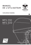 MANUEL D E L' U T I L I S A T E U R トーハツ船外機 オーナーズマニュアル Instructions traduites FR MFS 25D MFS 30D OB No.003-11171-3BE1 ENOM00001-0 VEUILLEZ LIRE ATTENTIVEMENT CE MANUEL AVANT D'UTILISER LE MOTEUR HORS-BORD. LE NON-RESPECT DES INSTRUCTIONS ET DES MESURES DE SÉCURITÉ CONTENUES DANS CE MANUEL PEUT ENTRAÎNER DES PRÉJUDICES CORPORELS GRAVES OU UN ACCIDENT MORTEL. CONSERVEZ CE MANUEL DANS UN LIEU SÛR POUR TOUTE RÉFÉRENCE ULTÉRIEURE. Copyright © 2025 Tohatsu Corporation. Tous droits réservés. Il est strictement interdit de reproduire ou de diffuser tout ou partie de ce manuel, sous quelque forme ou de quelque manière que ce soit, sans l'autorisation expresse écrite de Tohatsu Corporation. 3 PRÉSENTATION DE VOTRE MOTEUR HORS-BORD TOHATSU ENOM00006-2 Cher client, Félicitations pour votre achat du moteur hors-bord TOHATSU. Vous êtes désormais l'heureux propriétaire d'un excellent moteur hors-bord qui vous satisfera pendant de longues années. Ce manuel de l'utilisateur contient des informations importantes sur la sécurité, le fonctionnement et l'entretien. L'efficacité et la longévité de votre moteur hors-bord dépendront fortement de vos méthodes de fonctionnement et de l'entretien périodique. Ne pas utiliser et entretenir votre moteur hors-bord conformément aux instructions de ce manuel de l'utilisateur peut annuler la garantie limitée, ainsi que réduire l'efficacité et la fiabilité du moteur hors-bord. Toute personne utilisant un moteur hors-bord TOHATSU doit lire attentivement et comprendre entièrement le contenu de ce manuel avant toute utilisation. Pour des raisons de sécurité, suivez tous les avertissements de sécurité contenus dans le manuel de l'utilisateur et les étiquettes apposées sur votre moteur hors-bord. Vous devez conserver ce manuel de l'utilisateur à portée de main lorsque vous utilisez votre moteur horsbord. Lors de la revente du moteur hors-bord, veillez à transmettre ce manuel au nouveau propriétaire. En cas de problème, veuillez contacter un atelier de service ou un revendeur agréé TOHATSU pour obtenir de l'aide. Tohatsu Corporation se réserve le droit de changer, modifier, ajouter ou supprimer une partie ou l'intégralité du manuel de l'utilisateur sans préavis et sans aucune obligation. Nous sommes ravis de participer à vos aventures nautiques et souhaitons une expérience de navigation agréable et sûre. TOHATSU CORPORATION ENOM00113-1 DÉCLARATION DE CONFORMITÉ (DoC) Ce produit est conforme à certaines parties des directives de l'UE et des réglementations du Royaume-Uni. La Déclaration de Conformité (DoC) contient les informations suivantes : Nom et adresse du fabricant, UE - organisme notifié, UE - représentant autorisé et Royaume-Uni - organisme agréé. Directives et réglementations appliquées. Normes de référence. Description du produit (Nom du modèle et numéro de série). Signature du responsable (Nom / Titre / Date et lieu de délivrance). ENOM00002-0 ENREGISTREMENT ET IDENTIFICATION DU PROPRIÉTAIRE Dès l'achat de ce produit, veillez à remplir correctement et complètement le CERTIFICAT DE GARANTIE avant de le renvoyer par courrier au destinataire mentionné sur le certificat. Ce CERTIFICAT DE GARANTIE permet d'identifier le propriétaire légal du produit tout en faisant office de contrat de garantie. CONFORMÉMENT À LA LÉGISLATION EN VIGUEUR, VOTRE MOTEUR HORS-BORD NE SERA PAS COUVERT PAR LA GARANTIE LIMITÉE APPLICABLE SI CETTE PROCÉDURE N'EST PAS SUIVIE. 4 ENOM00003-1 CONTROLE AVANT LIVRAISON Assurez-vous que le contrôle avant livraison a été effectué correctement par le concessionnaire TOHATSU agréé avant d'utiliser votre moteur hors-bord. ENOM00005-1 Numéro de série Votre moteur hors-bord a un numéro de série unique. Le numéro de série est l'identification du moteur hors-bord et se trouve sur le moteur hors-bord comme indiqué dans les figures ci-dessous. Le numéro de série est requis pour l'enregistrement de la garantie, le dépôt d'une demande de garantie ainsi que pour les demandes de renseignements techniques et peut être requis pour d'autres occasions. Par conséquent, veuillez noter le numéro de série et la date d'achat dans l'espace ci-dessous. Numéro de série : Modèle MF/ E ENOF02502-0 ENOF02500-0 Modèle ET ENOF02501-0 Numéro de série : Date d'achat 5 ENOM00007-0 NOTIFICATION : DANGER / AVERTISSEMENT / ATTENTION / Remarque Avant l'installation, la mise en service ou toute autre manipulation de votre moteur hors-bord, veillez à lire et à comprendre l'intégralité de ce manuel d'utilisation, et à suivre attentivement toutes les instructions. Les informations précédées des mentions "DANGER", "AVERTISSEMENT", "ATTENTION" et "Remarque" sont particulièrement importantes. Faites tout spécialement attention à ce type d'information pour garantir un fonctionnement sûr du moteur hors-bord en tout temps. ENOW00001-0 DANGER Le non-respect de cette recommandation entraînera des préjudices corporels graves ou un risque mortel et d'éventuels dommages au produit. ENOW00002-0 AVERTISSEMENT Le non-respect de cette recommandation pourrait entraîner des préjudices corporels graves ou un risque mortel, voire des dommages au produit. ENOW00003-0 ATTENTION Le non-respect de cette recommandation pourrait entraîner des préjudices corporels ou des dommages au produit. ENON00001-0 Remarque Ces instructions fournissent des informations spécifiques visant à faciliter l'utilisation ou la maintenance du moteur hors-bord ou à clarifier certains points importants. CONTENUS 1. 2. 3. 4. 5. INFORMATIONS GÉNÉRALES DE SÉCURITÉ . . . . . . . . . . . . . . . . . . . . . . . . . . . .10 CARACTÉRISTIQUES TECHNIQUES . . . . . . . . . . . . . . . . . . . . . . . . . . . . . . . . . . . 12 NOM DES PIÈCES. . . . . . . . . . . . . . . . . . . . . . . . . . . . . . . . . . . . . . . . . . . . . . . . . 17 EMPLACEMENTS DES ÉTIQUETTES . . . . . . . .