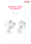 INSTRUCTIONS DE SERVICE LA-TO xx Applicateur Edition 9c - 2/2025 Instructions de service LA-TO xx Contenu A prendre en compte -5 Consignes générales -5 Validité et obligation de ces instructions -5 Représentation et information -6 Pour votre sécurité -8 Utilisation conforme -8 Information et qualification -8 Fonctions de sécurité -10 Fiabilité de la machine -14 Avant chaque début de production -15 Mises en garde figurant sur la machine -16 Description du produit -17 Caractéristiques techniques -17 Différences entre LA -TO et LA -TO XL -17 Dimensions -17 Prises -17 Matériel d'étiquetage -18 Capacité -18 Application -18 Conditions ambiantes -19 Aperçu -20 Appellation -20 Utilisation conforme -21 Configuration minimale requise -21 Types de construction -22 Description fonctionnelle -23 Éléments de commande et de raccordement -24 Menu des paramètres -26 (XPA 93x) Position des paramètres de l'applicateur dans le menu des paramètres -26 LA -TO -26 LA-TO TD -26 LA-TO BO Tempo (temporisé) -27 LA-TO BO Cellule (commandé par capteur) -27 (XLS 2xx, ALS 30x, ALX 73x) Position des paramètres de l'applicateur dans le menu des paramètres -28 02/2025 1 Contenu Instructions de service LA-TO xx Référence paramètre -29 Mode applicateur (systèmes d´impression-pose) -29 Mode applicateur (étiquetteuse) -29 Temps applicat. -29 Délai Fin Cycle (système d´impression-pose) -29 Délai Fin Cycle (étiquetteuse) -30 Délai redémarr. -30 Compens. Applic. -30 Capteur présence étiquette -31 Délai Expiré TouchDown -31 Temps soufflage -31 Mise en service -32 Montage -32 Sécurité -32 Consignes générales -32 Préparation du câble de raccordement pour le circuit de commutation Interlock -33 Montage sur XPA 93x -33 Montage sur ALX 73x -34 Montage sur XLS 2xx -35 Montage sur ALS 30x -36 Montage de l'unité de maintenance -37 Raccordement de l'air comprimé -38 Sélectionner la taille de la plaque de compression -41 Réglages -42 Configurations des paramètres -42 Position de la plaque de compression -44 Capteurs -46 Vannes -49 Fonctionnement -51 Mise en marche/hors marche de l'applicateur -51 Mise en marche -51 Mise hors marche -51 Remplacement de la plaque de compression -53 Remplacement de la plaque de compression sur LA-TO / LA-TO TD -53 Remplacement de la plaque de soufflage sur le LA-TO BO -54 Nettoyage -56 Sécurité -56 Périodicité de nettoyage -56 Nettoyage -56 Unité de maintenance -56 Élimination de pannes -58 Désactivation de l'air comprimé en cas de panne -58 Constatation de l'état -58 Appel du service après-ventes -58 02/2025 2 Contenu Instructions de service LA-TO xx Annexe -59 Plan pneumatique LA -TO -59 Plan pneumatique LA -TO BO -61 Aperçu des alésages - plaques de compression -63 Déclaration d'incorporation EU -64 Annexe à la déclaration d'incorporation -65 02/2025 3 Contenu Instructions de service LA-TO xx 02/2025 4 Contenu Instructions de service LA-TO xx A prendre en compte CONSIGNES GÉNÉRALES Validité et obligation de ces instructions Contenus Les instructions de service complètes pour les applicateurs LA-TO (XL), LA-TO TD (XL) et LA-TO BO (XL) comprennent les parties suivantes : • Mode d´emploi (pour personnel opérateur et de service) • Manuel de service (pour le personnel de service) • Catalogue des pièces de rechange (pour le personnel de service) Les présentes instructions de service décrivent l'installation et le fonctionnement du dénommé applicateur. Pour garantir la commande sûre et correcte de l'étiqueteuse / système d'impression & d'étiquetage avec LA-TO raccordé, il est indispensable de consulter également le mode d'emploi de l'étiqueteuse / système d'impression & d'étiquetage respectif. Pour toutes questions techniques n'étant pas décrites dans ce mode d'emploi : Tenir compte du manuel de service de l'applicateur resp. de l'imprimante ou demander l'aide d'un technicien de service de notre partenaire de distribution. Le service après-vente de notre partenaire de distribution est à votre disposition en cas de pannes. Désignation des appareils LA-TO est l'abréviation de « Label Applicator Touch-On », ce qui signifie « Applicateur d'étiquettes apposer ». La désignation « TO » (Touch-On) différencie cet applicateur des autres techniques d'application telles que par exemple par soufflage (anglais : Blow-On) ou en mouvement (anglais : Swing-On). Le modèle LA-TO est disponible en différentes versions. Pour plus d'informations, se référer au chapitre Aperçu à la page 20. Version technique 01/2024 Responsabilité NOVEXX Solutions se réserve le droit : • De modifier la construction, des composants et le logiciel et également d'utiliser d'autres composants, toutefois équivalents, que ceux indiqués, dans la mesure où ces modifications sont au profit du développement technique. • De modifier les informations contenues dans ces instructions. Une obligation à également appliquer ces modifications à des machines livrées au préalable est toutefois exclue. Droits d'auteur Tous les droits sur ces instructions et leurs annexes reviennent à la société NOVEXX Solutions. Toute reproduction, réimpression ou toutes autres copies, même uniquement de parties de ces instructions, sont uniquement autorisées sur accord écrit. 02/2025 | 02 5 A prendre en compte Instructions de service LA-TO xx Fabricant Novexx Solutions GmbH Ohmstraße 3 D–85386 Eching Tél. : +49-8165-925-0 Fax : +49-8165-925-231 www.novexx.com Représentation et information Explication des symboles Différents types d'informations sont marqués de manière distinctive pour faciliter la lisibilité et la vue d'ensemble : Instructions pour une action, dans un ordre quelconque 1. Instructions numérotées pour une action, texte instructif 2. Tenir compte de l'ordre indiqué ! Instruction particulière relative à l'exécution. A prendre en compte ! Description de la cause d'une erreur dans la documentation de référence des messages 