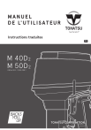 MANUEL D E L' U T I L I S A T E U R トーハツ船外機 オーナーズマニュアル Instructions traduites FR M 40D2 M 50D2 OB No.003-11038-PBE1 ENOM00001-0 VEUILLEZ LIRE ATTENTIVEMENT CE MANUEL AVANT D'UTILISER LE MOTEUR HORS-BORD. LE NON-RESPECT DES INSTRUCTIONS ET DES MESURES DE SÉCURITÉ CONTENUES DANS CE MANUEL PEUT ENTRAÎNER DES PRÉJUDICES CORPORELS GRAVES OU UN ACCIDENT MORTEL. CONSERVEZ CE MANUEL DANS UN LIEU SÛR POUR TOUTE RÉFÉRENCE ULTÉRIEURE. Copyright © 2025 Tohatsu Corporation. Tous droits réservés. Il est strictement interdit de reproduire ou de diffuser tout ou partie de ce manuel, sous quelque forme ou de quelque manière que ce soit, sans l'autorisation expresse écrite de Tohatsu Corporation. 3 PRÉSENTATION DE VOTRE MOTEUR HORS-BORD TOHATSU ENOM00006-2 Cher client, Félicitations pour votre achat du moteur hors-bord TOHATSU. Vous êtes désormais l'heureux propriétaire d'un excellent moteur hors-bord qui vous satisfera pendant de longues années. Ce manuel de l'utilisateur contient des informations importantes sur la sécurité, le fonctionnement et l'entretien. L'efficacité et la longévité de votre moteur hors-bord dépendront fortement de vos méthodes de fonctionnement et de l'entretien périodique. Ne pas utiliser et entretenir votre moteur hors-bord conformément aux instructions de ce manuel de l'utilisateur peut annuler la garantie limitée, ainsi que réduire l'efficacité et la fiabilité du moteur hors-bord. Toute personne utilisant un moteur hors-bord TOHATSU doit lire attentivement et comprendre entièrement le contenu de ce manuel avant toute utilisation. Pour des raisons de sécurité, suivez tous les avertissements de sécurité contenus dans le manuel de l'utilisateur et les étiquettes apposées sur votre moteur hors-bord. Vous devez conserver ce manuel de l'utilisateur à portée de main lorsque vous utilisez votre moteur horsbord. Lors de la revente du moteur hors-bord, veillez à transmettre ce manuel au nouveau propriétaire. En cas de problème, veuillez contacter un atelier de service ou un revendeur agréé TOHATSU pour obtenir de l'aide. Tohatsu Corporation se réserve le droit de changer, modifier, ajouter ou supprimer une partie ou l'intégralité du manuel de l'utilisateur sans préavis et sans aucune obligation. Nous sommes ravis de participer à vos aventures nautiques et souhaitons une expérience de navigation agréable et sûre. TOHATSU CORPORATION ENOM00003-1 CONTROLE AVANT LIVRAISON Assurez-vous que le contrôle avant livraison a été effectué correctement par le concessionnaire TOHATSU agréé avant d'utiliser votre moteur hors-bord. 4 ENOM00113-1 DÉCLARATION DE CONFORMITÉ (DoC) Ce produit est conforme à certaines parties des directives de l'UE et des réglementations du Royaume-Uni. La Déclaration de Conformité (DoC) contient les informations suivantes : Nom et adresse du fabricant, UE - organisme notifié, UE - représentant autorisé et Royaume-Uni - organisme agréé. Directives et réglementations appliquées. Normes de référence. Description du produit (Nom du modèle et numéro de série). Signature du responsable (Nom / Titre / Date et lieu de délivrance). ENON00937-0 Remarque Pour modèle avec marquage CE Le moteur hors-bord est destiné à être installé sur les bateaux de plaisance dans l'Union européenne car il n'est pas conforme aux exigences de la directive 2013/53/UE. ENOM00005-1 Numéro de série Votre moteur hors-bord a un numéro de série unique. Le numéro de série est l'identification du moteur hors-bord et se trouve sur le moteur hors-bord comme indiqué dans les figures ci-dessous. Le numéro de série est requis pour l'enregistrement de la garantie, le dépôt d'une demande de garantie ainsi que pour les demandes de renseignements techniques et peut être requis pour d'autres occasions. Par conséquent, veuillez noter le numéro de série et la date d'achat dans l'espace ci-dessous. Numéro de série : ENOF01300-1 Numéro de série : ENOF01901-1 Date d'achat : 5 ENOM00007-0 NOTIFICATION : DANGER / AVERTISSEMENT / ATTENTION / Remarque Avant l'installation, la mise en service ou toute autre manipulation de votre moteur hors-bord, veillez à lire et à comprendre l'intégralité de ce manuel d'utilisation, et à suivre attentivement toutes les instructions. Les informations précédées des mentions "DANGER", "AVERTISSEMENT", "ATTENTION" et "Remarque" sont particulièrement importantes. Faites tout spécialement attention à ce type d'information pour garantir un fonctionnement sûr du moteur hors-bord en tout temps. ENOW00001-0 DANGER Le non-respect de cette recommandation entraînera des préjudices corporels graves ou un risque mortel et d'éventuels dommages au produit. ENOW00002-0 AVERTISSEMENT Le non-respect de cette recommandation pourrait entraîner des préjudices corporels graves ou un risque mortel, voire des dommages au produit. ENOW00003-0 ATTENTION Le non-respect de cette recommandation pourrait entraîner des préjudices corporels ou des dommages au produit. ENON00001-0 Remarque Ces instructions fournissent des informations spécifiques visant à faciliter l'utilisation ou la maintenance du moteur hors-bord ou à clarifier certains points importants. CONTENUS 1. 2. 3. 4. 5. INFORMATIONS GÉNÉRALES DE SÉCURITÉ . . . . . . . . . . . . . . . . . . . . . . . . . . . .10 CARACTÉRISTIQUES TECHNIQUES . . . . . . . . . . . . . . . . . . . . . . . . . . . . . . . . . . . 12 NOM DES PIÈCES. . . . . . . . . . . . . . . . . . . . . . . . . . . . . . . . . . . . . . . . . . . . . . . . . 15 EMPLACEMENTS DES ÉTIQUETTES . . . . . . . . . . . . . . . . . . . . . . . . . . . . . . . . . . 20 INSTALLATION . . . . . . . . . . . . . . . . . . . . . . . . . . . . . . . . . . . . . . . . . . . . . . . . . . 24 1. Montage du moteur hors-bord sur le bateau . . . . . . . . . . . . . . . . . . . . . . 24 2. Installation de la batterie . . . . . . . . . . . . . . . . . . . . . . . . . . 