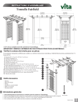 INSTRUCTIONS D'ASSEMBLAGE Tonnelle Fairfield www.wearevita.com 52,25 po 132,7 cm 77,75 po 197,5 cm 86,5 po 219,7 cm 82 po 208,3 cm 58,5 po 148,6 cm 80,5 po 204,5 cm 50 po 127 cm 10,25 po 26 cm S.V.P. lire au complet avant de commencer l'assemblage. 58 po 147,3 cm 24 po 61 cm 32 po 81,3 cm IMPORTANT: VÉRIFIEZ L'INTÉRIEUR DE VOS POTEAUX POUR TOUS LES MATÉRIAUX. Vérifier le contenu de la boîte pour ces pièces En cas de pièces manquantes ou défectueuses, veuillez s.v.p. contacter notre service à la clientèle au 1 800 282 9346, (du lundi au vendredi de 8 h à 17 h Heure de l'Est). 1. Chevrons (5) 1 1/2” x 4 1/2” x 38" (3,8 x 11,4 x 96,5 cm) 2. Embouts de pergola (14) 3. Capuchons de poteaux ( 4) 4. Poteaux (4) 4" x 4" x 84" (10 x 10 x 213,4 cm) 5. Garnitures de poteaux (4) 6. Poutres de support(2) 1 1/2” x 4 1/2” x 63 1/2" (3,8 x11,4 x 161,3 cm) 7. Barres supérieures de panneau (2) 1 1/2” x 1 1/2” x 31 5/8“ (3,8 x 3,8 x 80,3 cm) 8. Tiges verticales de panneau (10) 7/8” x 1 1/2” x 10 3/8” (2.2 x 3.8 x 26.4 cm) 9. Barres intérieures de panneau latéral (2) 1 1/2” x 1 1/2” x 31 5/8“ (3.8 x 3.8 x 80.3 cm) 10. Panneau latéral en treillis (2) 1/2” x 26 1/2” x 47 3/4” (1.3 x 64 x 118.7cm) 11. Barres inférieures horizontales (2) 1 1/2” x 1 1/2” x 31 5/8" (3.8 x 3.8 x80.3 cm) 12. Vis en acier inoxydable de 3 po (7,6 cm.) (pour chevrons) (30) 13. Tube de colle à vinyle Outils nécessaires 1 2 3 4 5 6 7 8 9 10 • Marteau • Ruban de mesure • Niveau • Escabeau ou courte échelle • Pelle ou vis sans fin • Perceuse sans fil Informations générales • • • • 11 Lisez attentivement les instructions au complet avant de commencer l'assemblage. Durant l'assemblage des pièces, placez-les sur une surface non-abrasive (e.g. boîte d'expédition) pour éviter les rayures. Nous recommandons une espace d'environ 10’x 8’ (3 m x 2,4 m) pour l'assemblage sans obstruction. Vous ne devrez pas avoir à utiliser une force excessive en assemblant les pièces. 12 (Pas à l'échelle) V2.8/111220 1 ÉTAPE UN Assembler le toit de la tonnelle 1 Placer les deux poutres de support comme illustré avec les trous pré-percés vers le haut. 2 Positionner les cinq chevrons sur les trous pré-percés respectifs sur les poutres de support comme illustré. 1 des vis de 3" (7,6 cm), fixez les cinq chevrons aux poutres 3 Àdel'aide support. Appliquer la colle à vinyle à l'intérieur des embouts et installer 4 les embouts de la pergola comme illustré. ÉTAPE DEUX 2 Assembler les panneaux latéraux 1 Insérez le treillis dans la barre inférieure comme illustré. Remarque : La barre inférieure aura 7 trous sur un côté seulement 2 Insérez le treillis dans la barre intérieure. Remarque : La barre intérieure aura 7 trous sur le côté inférieur et 5 trous sur le haut 3 3 Insérez les cinq tiges dans la partie supérieure de la barre supérieure. Remarque : La barre supérieure aura 5 trous sur un côté seulement Glissez la barre supérieure sur l'assemblage de treillis. 4 Répétez pour les autres panneaux latéraux. 4 1 2 2 Tonnelle Fairfield 3 4 ÉTAPE TROIS Fixer les panneaux latéraux aux poteaux 1 Prennez un poteau et complétez le panneau latéral en insérant l'assemblage du panneau latéral dans les trous sur le poteau. Poussez les barres jusqu'à ce que les languettes se fixent en place. 2 Répétez pour le poteau adjacent. Remarquez qu'il y a un poteau gauche et un droit. Ils sont marqués au haut du poteau. 1 ÉTAPE QUATRE 3 Glissez les garnitures en place comme illustré. 4 Si vous avez acheté l'ensemble de garniture, glisser également le deuxième ensemble de garniture et les moules de base à cette étape. 5 Collez et insérez les capuchons sur le dessus des poteaux comme illustré. 3 4 2 5 Tonnelle Fairfield 3 ÉTAPE CINQ Fixer le haut de la pergola aux poteaux 1 Placez les panneaux latéraux à leur position finale et réglez la largeur d'ouverture à 50 po (127 cm). Placez le haut de la tonnelle pré-assemblée sur le haut des poteaux comme illustré. 2 Fixez la poutre de support principale aux poteaux à l'aide de deux vis de chaque côté, comme illustré. 3 Fixer les chevrons aux poteaux à l'aide de deux vis de chaque côté, comme illustré. 2 50 p 127 o cm 1 3 Remarque : Pour coller la garniture du poteau en place : 1. Glissez la garniture du poteau vers le bas. 2. Appliquez une quantité généreuse de colle à vinyle autour du poteau 3. Glissez la garniture du poteau à nouveau vers le haut jusqu'à la position désirée et attendez quelques minutes pour laisser la colle sécher. 4 Tonnelle Fairfield 3 ÉTAPE SIX Installation de la tonnelle dans le sol Vous avez trois options pour effectuer cette étape. 1 (toutes achetées séparément) OPTION UN - Si votre tonnelle : • sera installée avec une clôture ou une barrière • est située dans une zone d'ouragans ou de vents élevés • est située dans des conditions de sol qui ne sont pas au niveau Considérez l'utilisation de : A - Ensemble professionnel d'extension de poteau 4 x 4 (30 po/76,2 cm de long), (ens. de 4) • Achetez chez Vita, www.wearevita.com • Recommandé pour une installation dans des pieds de béton • Suivez les instructions incluses avec l'ensemble (les poteaux ont été extensionés avec l'ensemble professionnel d'extension de poteau 4 x 4) 24 po. 61 cm B - Poteau de bois 4 x 4 x 3" (91,4 cm) de long (4) • Achetez séparément à votre centre de construction local. • Recommandé pour une installation dans une semelle de béton OPTION DEUX - Si votre tonnelle : 50 po 127 cm. 2 • Sera installée sur une surface de béton ou de bois pré-existante Considérez l'utilisation de : Ensemble de montage en surface 4 x 4 • Achat dans une quincaillerie locale • Suivez les instructions incluses avec l'ensemble (Les mesures indiquées sont de l'intérieur entre deux poteaux) 3 36 po. 91,4 cm 10 po. 25,4 cm En Terre avec pieds en béton (Option Un) (en supposant