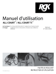 ® Manuel d'utilisation Au Fournisseur: Ce manuel doit être remis à l’usager de ce fauteuil roulant. À l’Usager: Veuillez lire tout le manuel et le conserver pour référence ultérieure. P/N 930491 Rev. E Manuel d ’instructions FAUTEUIL ROULANT INSTRUCTION D’UTILISATION Manuel d'utilisation All Court | I. Introduction SUNRISE EST À VOTRE ÉCOUTE Merci d’avoir choisi un fauteuil roulant RGK. N’hésitez pas à nous faire parvenir vos questions et commentaires sur ce manuel, sur la sécurité et la fiabilité de votre fauteuil et sur la prestation de service reçue de votre détaillant agréé de Sunrise Medical. N’hésitez pas à nous appeler ou à nous écrire à l’adresse indiquée ci-dessous : Sunrise Medical Customer Service Department 12002 Volunteer Blvd. Mount Juliet, TN 37122, USA (800) 333-4000 N’oubliez pas d’enregistrer votre fauteuil roulant et prévenez-nous si vous changez d’adresse. Cela nous permettra de vous faire parvenir des informations sur la sécurité, sur les nouveaux produits et sur les options afin de vous faire apprécier plus encore votre fauteuil roulant. Vous pouvez également enregistrer votre fauteuil sur : www.SunriseMedical.com/register LA RÉPONSE À VOS QUESTIONS Votre détaillant agréé Sunrise Medical connaît mieux que quiconque votre fauteuil roulant. Il pourrait donc répondre à la plupart de vos questions concernant la sécurité, l’utilisation et l’entretien. Remplissez le formulaire ci-dessous et conservez-le précieusement. Il pourra vous servir ultérieurement. www.SunriseMedical.com/register Détaillant : _____________________________________________________________________ Adresse : _______________________________________________________________________ ______________________________________________________________________________ Téléphone : _____________________________________________________________________ Numéro de série : _______________________________ Date d’achat : ______________________ 2 930491 Rev. E Manuel d'utilisation All Court | II. Sommaire I. INTRODUCTION ................................................................................ 2 VIII. AVERTISSEMENT : COMPOSANTS ET OPTIONS................. 11 II. SOMMAIRE ............................................................................................. 3 A. ANTI-BASCULANTS (En option).......................................... 11 III. VOTRE FAUTEUIL ET SES COMPOSANTS .................................. 4 B. ACCOUDOIRS .......................................................................... 11 IV. AVIS – À LIRE AVANT UTILISATION ............................................. 5 C. COUSSINS ET BASES DE SIÈGE SOUPLE .......................... 11 A. CHOISIR LE BON APPAREIL et LES BONNES OPTIONS DE SÉCURITÉ ............................................................................... 5 D. FIXATIONS ................................................................................. 11 B. CONSULTEZ CE MANUEL RÉGULIÈREMENT .................. 5 F. C. AVERTISSEMENTS ....................................................................... 5 V. AVERTISSEMENTS D’ORDRE GÉNÉRAL........................................ 5 A. CHARGE MAXIMALE ................................................................ 5 B. MUSCULATION .......................................................................... 5 C. APPRENDRE À CONNAÎTRE VOTRE FAUTEUIL.............. 5 D. POUR RÉDUIRE LE RISQUE D’ACCIDENT :...................... 5 E. LISTE DE CONTRÔLE DE SÉCURITÉ .................................. 5 F. MODIFICATIONS ET RÉGLAGES .......................................... 6 G. CONDITIONS ENVIRONNEMENTALES ............................. 6 H. TERRAIN........................................................................................ 6 I. UTILISATION SUR ROUTE ...................................................... 6 J. SÉCURITÉ A BORD D’UN VÉHICULE AUTOMOBILE...... 6 K. BESOIN D’AIDE ? ........................................................................ 6 VI. AVERTISSEMENTS : CHUTES ET BASCULEMENTS .................. 7 A. POINT D’ÉQUILIBRE ................................................................. 7 B. S’HABILLER OU CHANGER DE VÊTEMENTS .................... 7 C. FAIRE UNE ROUE ARRIÈRE ..................................................... 7 D. OBSTACLES .................................................................................. 7 E. S’ÉTIRER OU SE PENCHER...................................................... 8 F. RECULER ....................................................................................... 8 G. RAMPES D’ACCÈS, PENTES ET INCLINAISONS ............... 8 H. TRANSFERT .................................................................................. 9 I. TROTTOIRS ET MARCHES ...................................................... 9 J. ESCALIERS..................................................................................... 9 K. ESCALIERS ROULANTS ............................................................ 9 VII. AVERTISSEMENTS - UTILISATION EN TOUTE SÉCURITÉ .. 10 A. APPRENDRE À FAIRE UNE ROUE ARRIÈRE..................... 10 B. DESCENDRE UN TROTTOIR OU UNE MARCHE SIMPLE ............................................................ 10 C. MONTER UN TROTTOIR OU UNE MARCHE SIMPLE . 10 D. MONTER DES ESCALIERS ..................................................... 10 E. DESCENDRE DES ESCALIERS ............................................... 10 F. ENTRETIEN ................................................................................ 10 930491 Rev. E E. REPOSE-PIEDS ............................................................................ 11 PNEUS .......................................................................................... 11 G. SANGLE DE MAINTIEN (EN OPTION) ............................. 12 H. BLOC MOTEUR......................................................................... 12 I. 