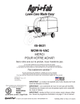 45-0631 MOW-N-VAC MERCI POUR VOTRE ACHAT! Sans votre avis sur le produit, nous n’existons pas. Si vous êtes satisfait de nos produits et services de qualité, s'il vous plaît, prenez juste un moment pour laisser des commentaires positifs et un bref aperçu de notre produit sur notre site Web ou sur le site Web de votre détaillant. Pas totalement satisfait ? Si vous rencontrez des problèmes, n’hésitez pas à nous contacter. Nous faisons parfois des erreurs, mais donnez-nous une chance Pour bien faire les choses avant de laisser des commentaires négatifs sur notre produit. Customer Care M-F 7:00 a.m. - 5:00 p.m. CST 800-448-9282 www.agri-fab.com MADE IN USA WITH GLOBAL COMPONENTS IMPORTANT : Le moteur est expédié sans huile. Ajoutez de l'huile avant de démarrer le moteur. Vous souhaitez plus d'informations ou des conseils de montage ? Vidéo Instruction Guide youtube.com/c/agrifab IMPORTANT: Les roulements de roue ne sont pas pré-lubrifiés. Remplissez les moyeux de roue de graisse après avoir assemblé les roues à l'essieu. IMPORTANT: Vérifiez le filtre à air du moteur avant chaque utilisation. Suivez le programme d'entretien à la page 17 de ce manuel. le moyen le plus rapide d'acheter des pièces www.speedepart.com FORMULAIRE # 3-463 (11/11/2024) TABLE DES MATIÈRES RÈGLES DE SÉCURITÉ........................................ 3,4,5 TABLEAU PLEINE GRANDEUR DU MATÉRIEL..... 6,11 CONTENU DU CARTON.............................................. 7 ASSEMBLÉ.............................................................8-13 OPÉRATION.......................................................... 14,15 MAINTENANCE.................................................... 16,17 STOCKAGE................................................................ 18 DÉPANNAGE............................................................. 18 SCHÉMAS DES PIÈCES......................................19-22 GUIDE DES PISTES.................................................. 23 ACCESSOIRE EN OPTION MODÈLE 45-0253 12 PIEDS KIT DE TUYAU À DISTANCE Le kit de tuyau à distance, Modèle 45-0253, fournit 12 pieds x 5 pouces diamètre du tuyau à nettoyer autour des arbustes, des patios, des puits de fenêtre et d'autres zones non accessibles au tracteur. 2 SÛRETÉ Tout équipement électrique peut causer des blessures s’il est utilisé de manière incorrecte ou si l’utilisateur ne comprend pas comment utiliser l’équipement. Soyez toujours prudent lorsque vous utilisez des équipements électriques. DANGER: Ce Mow-N-Vac a été construit pour être utilisé conformément aux règles de sécurité de fonctionnement dans ce manuel. Comme pour tout type d’équipement électrique, la négligence ou l’erreur de la part de l’opérateur peut entraîner des blessures graves. Cette unité est capable d'amputer les doigts et les mains et de lancer des objets. Le non-respect des consignes de sécurité suivantes peut entraîner des blessures graves, voire la mort. • • • • • • • • • • • • • • • • Lisez et suivez toutes les instructions de ce manuel avant d'essayer d'assembler ou d'utiliser cet équipement. Le non-respect de ces instructions peut entraîner des blessures corporelles. Conservez ce manuel dans un endroit sûr pour référence ultérieure et pour commander des pièces de rechange. Lisez attentivement ce manuel d'instructions d'utilisation et d'entretien. Familiarisez-vous parfaitement avec les commandes et l'utilisation correcte de cet appareil Mow-N-Vac. Lisez le manuel du propriétaire du véhicule et les règles de sécurité d’utilisation du véhicule avant d’utiliser cet équipement. Ne laissez jamais les enfants de moins de 16 ans utiliser ce MowN-Vac. Les enfants de 16 ans et plus ne doivent l'utiliser que sous la surveillance étroite de leurs parents. Ne laissez personne utiliser cet équipement sans instructions appropriées. Ne laissez pas les passagers voyager sur cet équipement ou sur le véhicule tracteur. Gardez la zone de travail libre de toute personne, en particulier des jeunes enfants. Gardez également la zone libre d'animaux domestiques. Vérifiez le niveau de carburant avant de démarrer le moteur. Ne remplissez pas le réservoir de carburant à l’intérieur, lorsque le moteur tourne ou lorsque le moteur est chaud. Essuyez tout carburant renversé avant de démarrer le moteur. Le moteur et le silencieux deviennent chauds. Ne pas les toucher ! Pour éviter tout risque d'incendie, éviter tout débris ou autre accumulation. Ne rangez jamais l'aspirateur Mow-N-Vac avec du carburant dans le réservoir. Laissez le moteur refroidir avant de le ranger dans un endroit fermé. Ne modifiez pas les paramètres du régulateur du moteur. Ne faites pas fonctionner le moteur si le filtre à air ou le couvercle est retiré, sauf pour effectuer un réglage. Le retrait de ces pièces peut créer un risque d'incendie. Gardez les mains, les pieds, le visage, les cheveux longs et les vêtements hors de la zone d'entrée et de sortie. Il y a des LAMES ROTATIVES à l'intérieur de ces ouvertures. Avant de nettoyer, réparer ou inspecter, assurez-vous que toutes les pièces mobiles sont complètement arrêtées. Débranchez le fil de la bougie d'allumage et gardez le fil éloigné de la bougie pour éviter un démarrage accidentel. Gardez le levier de commande des gaz en position d'arrêt. Si le Mow-N-Vac est bloqué par des débris, coupez le moteur et attendez que la turbine s'arrête complètement avant de tenter de retirer l'obstruction. Débranchez le fil de la bougie pour éviter tout démarrage accidentel. Si le mécanisme de coupe heurte un corps étranger ou si votre MowN-Vac commence à vibrer anormalement, arrêtez immédiatement le moteur, débranchez le fil de la bougie et éloignez le fil de la bougie. Laissez la machine s'arrêter et suivez les étapes suivantes. a. Inspectez pour détecter d'éventuels dommages. b. Réparez ou remplacez toutes le