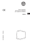 Notice d'utilisation Electronique de diagnostic pour capteurs de vibrations 11610580/00 07/2024 VSE100 FR Contenu 1 Remarques préliminaires .....................................................................................3 2 Consignes de sécurité .........................................................................................3 3 Fonctionnement et caractéristiques .....................................................................3 4 Montage ...............................................................................................................5 4.1 Montage des capteurs ...................................................................................5 5 Raccordement électrique .....................................................................................6 5.1 Limited voltage / current ................................................................................6 5.2 Schéma de branchement ..............................................................................7 5.2.1 Branchement des capteurs 1...4 (S1...S4) selon l‘utilisation ................8 5.3 Raccordement des capteurs ..........................................................................9 5.3.1 Contrôle du câble capteur ....................................................................9 5.4 Adresse IP .....................................................................................................9 5.5 Connexion Ethernet .......................................................................................9 6 Fonctionnement ...................................................................................................9 6.1 Réglages, paramétrage ..............................................................................10 6.1.1 Remarque sur le nombre limité d‘accès en écriture ...........................10 7 Eléments de visualisation (LED) ........................................................................12 8 Maintenance, réparation et élimination ..............................................................13 9 Schéma d'encombrement ..................................................................................13 2 1 Remarques préliminaires • Une demande d'opération est indiquée par "►". Exemple : ► Monter l'appareil selon l’illustration. Remarque importante Le non-respect peut aboutir à des dysfonctionnements ou perturbations. Information Remarque supplémentaire. 2 Consignes de sécurité • Avant la mise en service de l'appareil, lire la notice d'utilisation. S'assurer que le produit est approprié pour l'application concernée sans aucune restriction d'utilisation. • L'appareil est conforme aux dispositions et directives de l'UE en vigueur. • L'emploi non approprié ou incorrect peut mener à des défauts de fonctionnement de l'appareil ou à des effets non désirés dans votre application. • Le montage, le raccordement électrique, la mise en service, le fonctionnement et l'entretien de l'appareil doivent être effectués par du personnel qualifié et autorisé par le responsable de l'installation. • La construction de l'appareil est conforme à la classe de protection III (EN61010) sauf l'espace autour des bornes. La protection contre le contact accidentel (protection contre le contact du doigt selon IP 20) pour le personnel lors de la manipulation de l'appareil n'est assurée qu'en cas de bornes complètement fixées. De ce fait, l'appareil doit toujours être installé dans une armoire électrique ayant une protection IP 54 minimum et dont l'ouverture n'est possible qu'à l'aide d'un outil. • Pour les appareils DC l'alimentation 24 V DC externe doit être générée et fournie selon les critères de la basse tension de sécurité (TBTS) parce que cette tension est disponible sans plus de mesures de protection près des éléments de service et sur les bornes pour l'alimentation des capteurs raccordés. 3 Fonctionnement et caractéristiques • L'électronique de diagnostic dispose de 2 entrées analogiques et 4 entrées dynamiques. Ces entrées peuvent être utilisées pour une surveillance de 3 valeurs process, surveillance vibratoire, diagnostic des vibrations ou analyse d'autres signaux dynamiques. La fonction finale dépend de la version du firmware correspondant. Les versions actuelles du firmware et du logiciel de paramétrage peuvent toujours être téléchargées dans la zone de téléchargement d'ifm electronic. • Sur les entrées analogiques, un signal de courant analogique ou un signal d'impulsion peuvent être raccordés. Ceux-ci peuvent être utilisés en tant que source de vitesse de rotation pour un diagnostic des vibrations, en tant que trigger d'une mesure ou pour la surveillance de valeurs process. • Sur les entrées dynamiques, un signal de courant analogique peut également être raccordé, pour la surveillance de max. 4 valeurs process supplémentaires. Comme alternative, jusqu'à 4 capteurs de vibrations d'ifm (types VSA, VSP) ou capteurs avec un signal standard IEPE peuvent être raccordés. • Les possibilités de la surveillance des signaux et de l'analyse des signaux dépendent de la version correspondante du firmware. Le firmware et le programme utilisateur pour PC actuels peuvent être téléchargés dans la zone de téléchargement d'ifm. • Les états d'alarme des tâches de surveillance (valeurs process et/ou objets) sont indiqués via les LED du capteur correspondant raccordé sur l'électronique de diagnostic ou/et les 2 sorties matériel. Les sorties matériel peuvent être configurées en tant que 2 x TOR (no/nf) ou 1 x analogique (0/4...20 mA) et 1 x TOR (no/nf). • Les 8 E/S TOR de l'électronique de diagnostic peuvent être utilisées soit en tant que sorties alarme supplémentaires (no/nf), soit en tant qu'entrées TOR (variantes, remise à zéro des compteurs). Les fonctions du firmware incluent entre autres : • Surveillance en ligne - De valeurs process (signaux anal