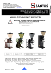 SANTOS : Manuel d'utilisation et d’entretien SANTOS SAS : 140-150 AVENUE ROGER SALENGRO 69120 VAULX-EN-VELIN (LYON) - FRANCE TÉL. 33 (0) 472 37 35 29 - FAX 33 (0) 478 26 58 21 E-Mail :[email protected] www.santos.frTO MOULIN A CAFE n°1, 01BAR et n°1PS MOULIN A CAFE BOUTIQUE n°4 MANUEL D’UTILISATION ET D’ENTRETIEN ! IMPORTANT : documents inclus dans ce manuel et à conserver : • DECLARATION « CE » DE CONFORMITE • CERTIFICAT DE GARANTIE VERSION ORIGINALE Modèle n°01 Modèle n°01 PS Modèle n°01BAR Modèle n°04 Coffee grinders - Fruit juicers - Mixers - Blenders - Drinks dispensers - Planetary mixers Cheese graters - Ice crushers - Mincers - Vegetable slicers – Dough mixer Moulins à café - Presse-fruits - Mixers - Blenders - Distributeurs de boissons - Batteurs mélangeurs - Pétrin - Râpes à fromage - Broyeurs à glaçons - Hache-viande - Coupe-légumes MODELES DEPOSES FRANCE ET INTERNATIONAL INTERNATIONALLY PATENTED MODELS 98101 FR 4.0 - 12 2024 1 / 23 www.santos.fr SANTOS : Manuel d'utilisation et d’entretien SOMMAIRE DECLARATION “CE/UE” DE CONFORMITE ......................................................................3 REGLES DE SECURITES...................................................................................................4 CONTRE INDICATIONS : ................................................................................................4 BRANCHEMENT ELECTRIQUE :....................................................................................5 RECYCLAGE DU PRODUIT EN FIN DE VIE ..................................................................5 VOTRE MOULIN A CAFE ...................................................................................................6 UTILISATION DE L’APPAREIL ...........................................................................................6 REGLAGE DE LA MOUTURE .........................................................................................6 ENTRETIEN .....................................................................................................................6 MAINTENANCE ...............................................................................................................6 Pièces détachées : .......................................................................................................6 Non usage prolongé : ......................................................... Erreur ! Signet non défini. REMPLACEMENT DES MEULES ...................................................................................7 REGLAGE DE L'ECARTEMENT MINIMUM DES MEULES ............................................8 AIDE AU DEPANNAGE .......................................................................................................9 L'appareil ne démarre pas : ..........................................................................................9 L'appareil s'arrête suite à une chauffe moteur : ............................................................9 L'appareil s'arrête suite à une surcharge : ....................................................................9 CARACTERISTIQUES TECHNIQUES DE L’APPAREIL...................................................10 Schéma électrique 110-120V 50/60Hz Modèle n°1 .......................................................11 Schéma électrique 220-240V 50Hz Modèle n°1 ............................................................12 Schéma électrique 220-240V 60Hz Modèle n°1 ............................................................13 Schéma électrique 110-120V 50/60Hz Modèle n°1 BARISTA .......................................14 Schéma électrique 220-240V 50Hz Modèle n°1 BARISTA ............................................15 Schéma électrique 220-240V 60Hz Modèle n°1 BARISTA ............................................16 Schéma électrique 110-120V 50/60Hz Modèle n°4 .......................................................17 Schéma électrique 220-240V 50Hz Modèle n°4 ............................................................18 Schéma électrique 220-240V 60Hz Modèle n°4 ............................................................19 Figures ...........................................................................................................................20 CERTIFICAT DE GARANTIE ..........................................................................................23 PLAQUE SIGNALETIQUE DE L’APPAREIL ...................................................................23 98101 FR 4.0 - 12 2024 2 / 23 www.santos.fr SANTOS : Manuel d'utilisation et d’entretien DECLARATION “CE/UE” DE CONFORMITE LE FABRICANT : SANTOS SAS - 140-150, Av. Roger SALENGRO 69120 VAULX-EN-VELIN (LYON) FRANCE Déclare que l’appareil destiné à être mis sur le marché professionnel, désigné ci-après : Désignation : Moulin à café boutique Numéro de type : 01, 01BAR, 01PS, 01P, 04 est conforme : • aux dispositions réglementaires définies par l’annexe 1 de la directive européenne "machines" n°2006/42/CE, et aux législations nationales la transposant. • aux dispositions réglementaires des directives et règlements européens suivants : o N° 2014/35/UE (Directive basse tension) o N° 2014/30/UE (Directive CEM) o N° 2011/65/UE (Directive RoHS) o N° 2012/19/UE (Directive DEEE) o N° 1935/2004/CE (Règlement) concernant les matériaux et objets destinés à entrer en contact avec des denrées alimentaires o N° 10/2011/UE (Règlement) concernant les matières plastiques destinées au contact des aliments Normes européennes harmonisées utilisées pour donner présomption de conformités aux exigences essentielles des directives citées précédemment : • NF EN ISO 12100 : 2010: Sécurités des Machines - Principes généraux de conception • NF EN 60204-1: 2018: Sécurités des machines - Équipement électrique des machines Règles générales • NF EN 1672-2 : 2020, Machines pour les prod