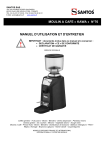 SANTOS SAS : 140-150 AVENUE ROGER SALENGRO 69120 VAULX-EN-VELIN (LYON) - FRANCE TÉL. 33 (0) 472 37 35 29 - FAX 33 (0) 478 26 58 21 E-Mail :[email protected] www.santos.fr MOULIN A CAFE « KAWA » N°76 MANUEL D’UTILISATION ET D’ENTRETIEN ! IMPORTANT : documents inclus dans ce manuel et à conserver : • DECLARATION « CE » DE CONFORMITE • CERTIFICAT DE GARANTIE VERSION ORIGINALE Coffee grinders - Fruit juicers - Mixers - Blenders - Drinks dispensers - Planetary mixers Cheese graters - Ice crushers - Mincers - Vegetable slicers – Dough mixer Moulins à café - Presse-fruits - Mixers - Blenders - Distributeurs de boissons - Batteurs mélangeurs - Pétrin Râpes à fromage - Broyeurs à glaçons - Hache-viande - Coupe-légumes MODELES DEPOSES FRANCE ET INTERNATIONAL INTERNATIONALLY PATENTED MODELS SOMMAIRE DECLARATION “CE/UE” DE CONFORMITE ........................................................................... 3 REGLES DE SECURITES ............................................................................................................... 4 INSTALLATION, MANUTENTION ................................................................................................. 4 CONTRE INDICATIONS : .............................................................................................................. 4 BRANCHEMENT ELECTRIQUE : ................................................................................................. 5 1ere MISE EN ROUTE ...................................................................................................................... 5 RECYCLAGE DU PRODUIT EN FIN DE VIE ............................................................................... 6 VOTRE MOULIN A CAFE N°76 .................................................................................................... 6 UTILISATION DE L’APPAREIL ................................................................................................... 6 MISE EN ROUTE : .......................................................................................................................... 6 UTILISATION :................................................................................................................................ 6 Réglage de la mouture : ............................................................................................................... 7 NETTOYAGE :................................................................................................................................. 7 MAINTENANCE .............................................................................................................................. 7 Pièces détachées :......................................................................................................................... 7 Remplacement des meules de broyage : ...................................................................................... 8 AIDE AU DEPANNAGE .................................................................................................................. 9 L'appareil ne démarre pas : .......................................................................................................... 9 L'appareil s'arrête suite à une chauffe moteur : (le bloc moteur est chaud) ................................. 9 L'appareil s'arrête suite à une surcharge : .................................................................................... 9 L'appareil tourne sans remplir le porte-filtre ............................................................................. 10 CARACTERISTIQUES TECHNIQUES DE L’APPAREIL ...................................................... 10 CARACTERISTIQUES TECHNIQUES ......................................................................................... 10 Schéma électrique 110-120V 50/60Hz et 220-240V 50/60Hz ..................................................... 11 Tableau de correspondance des éléments ................................................................................... 12 CERTIFICAT DE GARANTIE ................................................................................................... 14 PLAQUE SIGNALETIQUE DE L’APPAREIL ........................................................................ 14 98176 FR 0.4 - 05 2024 2 / 14 www.santos.fr FR SANTOS : Manuel d'utilisation et d’entretien FR SANTOS : Manuel d'utilisation et d’entretien DECLARATION “CE/UE” DE CONFORMITE LE FABRICANT : SANTOS SAS - 140-150, Av. Roger SALENGRO 69120 VAULX-EN-VELIN (LYON) FRANCE Déclare que l’appareil destiné à être mis sur le marché professionnel, désigné ci-après : Désignation : Numéro de type : Moulin à café « Kawa » 76 est conforme : • aux dispositions réglementaires définies par l’annexe 1 de la directive européenne "machines" n°2006/42/CE, et aux législations nationales la transposant. • aux dispositions réglementaires des directives et règlements européens suivants : o N° 2014/35/UE (Directive basse tension) o N° 2014/30/UE (Directive CEM) o N° 2014/65/UE (Directive RoHS) o N° 2012/19/UE (Directive DEEE) o N° 1935/2004/CE (Règlement) concernant les matériaux et objets destinés à entrer en contact avec des denrées alimentaires o N° 10/2011/UE (Règlement) concernant les matières plastiques destinées au contact des aliments Normes européennes harmonisées utilisées pour donner présomption de conformités aux exigences essentielles des directives citées précédemment : • NF EN ISO 12100 : 2010, Sécurités des Machines - Principes généraux de conception • NF EN 60204-1 : 2018, Sécurités des machines - Équipement électrique des machines Règles générales • NF EN 1672-2 : 2020, Machines pour les produits alimentaires - Notions fondamentales Prescriptions relatives à l’hygiène. • NF EN 60335-1 : 2013, Sécurité des appareils électrodomestiques et analogues • NF EN 60335-2-64 : 2004, Règles particuli