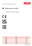 Instructions pour installation, utilisation et entretien F Brûleurs gaz à air soufflé Fonctionnement à deux allures progressif CODE MODÈLE TYPE 3783302 3784402 3784403 3784502 3784503 3784702 3784703 RS 28 RS 38 RS 38 RS 38 RS 38 RS 50 RS 50 809 T1 810 T1 810 T1 810 T1 810 T1 811 T1 811 T1 20144600 (2) - 02/2022 Traduction des instructions originales Contents 1 Déclarations................................................................................................................................................................................ 3 2 Informations et avertissements généraux ............................................................................................................................... 4 3 4 5 6 2.1 2.1.1 2.1.2 2.1.3 2.1.4 Informations sur le manuel d’instructions .................................................................................................................... 4 Introduction.................................................................................................................................................................. 4 Dangers génériques .................................................................................................................................................... 4 Autres symboles.......................................................................................................................................................... 4 Livraison de l’équipement et du manuel d’instructions correspondant........................................................................ 5 2.2 Garantie et responsabilité ........................................................................................................................................... 5 Sécurité et prévention................................................................................................................................................................ 6 3.1 Avant propos ............................................................................................................................................................... 6 3.2 Formation du personnel .............................................................................................................................................. 6 Description technique du brûleur............................................................................................................................................. 7 4.1 Désignation des brûleurs............................................................................................................................................. 7 4.2 Modèles disponibles.................................................................................................................................................... 7 4.3 Catégories du brûleur - Pays de destination ............................................................................................................... 8 4.4 Données techniques.................................................................................................................................................... 8 4.5 Données électriques.................................................................................................................................................... 8 4.6 Dimensions d’encombrement...................................................................................................................................... 9 4.7 Matériel fourni avec l’équipement................................................................................................................................ 9 4.8 Plages de travail........................................................................................................................................................ 10 4.9 4.9.1 Chaudière d’essai...................................................................................................................................................... 10 Chaudières commerciales......................................................................................................................................... 11 4.10 Description du brûleur ............................................................................................................................................... 12 4.11 Boîte de contrôle RMG88.......................................................................................................................................... 13 4.12 Servomoteur SQM..................................................................................................................................................... 14 Installation ................................................................................................................................................................................ 15 5.1 Indications concernant la sécurité pour l’installation ................................................................................................. 15 5.2 Manutention............................................................................................................................................................... 15 5.3 Contrôles préliminaires.............................................................................................................................................. 15 5.4 Position de fonctionnement ....................................................................................................................................... 16 5.5 5.5.1 5.5.2 5.5.3 Préparation de la chaudière ...................................................................................................................................... 16 Perçage de la plaque chaudière................................................................................................................................ 16 Longueur de la buse.....