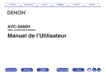 Connexions Lecture Réglages Conseils . Contents AVC-S660H AMPLI AUDIO/VIDEO RESEAU Manuel de l’Utilisateur Panneau avant Affichage Panneau arrière 1 Télécommande Index Annexe Contents Connexions Lecture Réglages 8 9 9 10 10 10 14 15 15 18 20 23 Accessories Insertion des piles Portée de la télécommande Caractéristiques Audio haute qualité Haute performance Fonctionnement aisé Nomenclature et fonctions Panneau avant Affichage Panneau arrière Télécommande Panneau avant Affichage 27 29 29 32 Panneau arrière Annexe Connexion d’un téléviseur Connexion 1 : Téléviseur équipé d’une borne HDMI et compatible avec la fonction ARC (Audio Return Channel) / eARC (Enhanced Audio Return Channel) Connexion 2 : Téléviseur équipé d’une borne HDMI et incompatible avec la fonction ARC (Audio Return Channel) / eARC (Enhanced Audio Return Channel) Connexion 3 : Téléviseur non équipé d’une borne HDMI Connexion d’un dispositif de lecture Connexion d’un décodeur (Tuner satellite/TV par câble) Connexion d’un lecteur multimédia Connexion d’un lecteur Blu-ray Disc ou d’un lecteur DVD Connexion d’une console de jeu ou d’un appareil de lecture compatible avec le 8K Connexion d’une platine Connecter un dispositif mémoire USB au port USB Connexion à un réseau domestique (LAN) LAN filaire LAN sans fil Connexion du cordon d’alimentation Connexions Installation des enceintes Branchement enceintes Avant le branchement des enceintes Connexion standard Conseils 2 Télécommande Index 33 34 35 36 37 38 39 40 41 42 43 44 44 45 46 Contents Connexions Lecture Réglages Lecture Utilisation basique Mise sous tension Sélection de la source d’entrée Réglage du volume Coupure temporaire du son (Sourdine) Lecture avec les lecteurs Blu-ray Disc/DVD Lecture du contenu d’un dispositif mémoire USB Lecture des fichiers d’un dispositif mémoire USB Écouter de la musique sur un périphérique Bluetooth Lecture de musique à partir d’un périphérique Bluetooth Appariement avec d’autres périphériques Bluetooth Reconnexion à cet appareil à partir d’un périphérique Bluetooth Écoute de l’audio avec un casque Bluetooth Écoute de l’audio avec un casque Bluetooth Reconnexion à un casque Bluetooth Déconnexion d’un casque Bluetooth Écoute de Radio Internet Écoute de Radio Internet Lecture de fichiers stockés sur un ordinateur ou un stockage NAS Lecture de fichiers stockés sur un ordinateur ou un stockage NAS Obtenir HEOS App Compte HEOS Lecture depuis des services de diffusion de musique Écouter la même musique dans plusieurs pièces Panneau avant Affichage Panneau arrière Conseils Annexe Fonction AirPlay Lecture de titres de votre iPhone, iPod touch ou iPad Lecture de la musique iTunes avec cet appareil Lisez un morceau depuis votre iPhone, votre iPodtouch ou votre iPad sur plusieurs appareils synchronisés (AirPlay 2) Fonction Spotify Connect Lecture de la musique Spotify avec cet appareil Fonctions pratiques Ajout des Favoris HEOS Lecture des Favoris HEOS Suppression des Favoris HEOS Réglage de l’audibilité des dialogues et voix (Amélior. Dialogues) Ajuster le volume de chaque canal pour le faire correspondre à la source d’entrée (Réglage niv. Canal) Réglage du tonalité (Tonalité) Réglage du retard audio (Délai audio) Affichage de la vidéo voulue lors de la lecture audio (Sélect.vidéo) 48 48 48 49 49 49 50 51 54 55 56 57 58 59 60 60 61 62 63 64 67 68 69 72 3 Télécommande Index 76 77 77 78 79 79 80 81 81 82 82 83 84 85 86 Contents Connexions Lecture Sélection d’un mode d’écoute Sélection d’un mode d’écoute Lecture directe Lecture surround auto Description des types de mode audio Mode son qui peut être sélectionné pour chaque signal d’entrée Fonction de contrôle HDMI Procédure de réglage Fonction de minuterie sommeil Utilisation de la minuterie sommeil Fonction de sélection rapide plus Solliciter le paramétrage Modification des réglages Fonction de verrouillage du panneau Désactivation de toutes les opérations de touche Désactivation de toutes les opérations de touche sauf VOLUME Annulation de la fonction de verrouillage du panneau Fonction de verrouillage à distance Désactivation de la fonction de capteur de la télécommande Activation de la fonction du capteur à distance Fonction de contrôle Internet Contrôle de l’appareil à partir d’un contrôle Web Panneau avant Affichage Panneau arrière Réglages Conseils Annexe Réglages 87 88 89 89 90 93 96 96 97 98 99 100 101 102 102 102 103 104 104 104 105 105 Plan du menu de l’interface graphique Fonctionnement du menu Audio Niveau sub. Paramètres surr. Restorer Volume Audyssey® EQ manuel Vidéo Config.HDMI HDMI Upscaler Affichage écran Economiseur d'écran Format signal 4K/8K Configuration HDCP Format TV 4 Télécommande Index 107 111 112 112 112 117 118 119 121 124 124 128 129 130 130 132 132 Contents Connexions Lecture Entrées Affect entrée Rennomer.Sources Masquer sources Niv.source Enceintes Conf. Audyssey® Procédure pour les réglages des enceintes (Conf. Audyssey®) Message d’erreur Retour aux réglages “Conf. Audyssey®” Config.manuelle Config.Enceintes Distances Niveaux Crossover Graves Panneau avant Affichage Panneau arrière Réglages 133 133 136 136 136 137 137 139 145 146 147 147 149 150 151 152 Conseils 153 153 153 154 155 157 157 158 158 159 160 160 160 Réseau Informations Connexion Config.Wi-Fi Réglages Contrôle réseau Nom convivial Diagnostic AirPlay Wi-Fi et Bluetooth Compte HEOS Vous ne vous êtes pas connecté Vous êtes déjà connecté 5 Télécommande Annexe Index Contents Connexions Lecture Affichage Panneau arrière Conseils Annexe Conseils 161 161 161 164 165 165 166 169 171 171 172 172 Général Langue ECO Émetteur Bluetooth Sélect.Rapid.Nom Afficheur façade Micrologiciel Informations Données d'util. Sauveg.& charger Verrou config. Réinitialiser Panneau avant Réglages Conseils Dépistage des panne